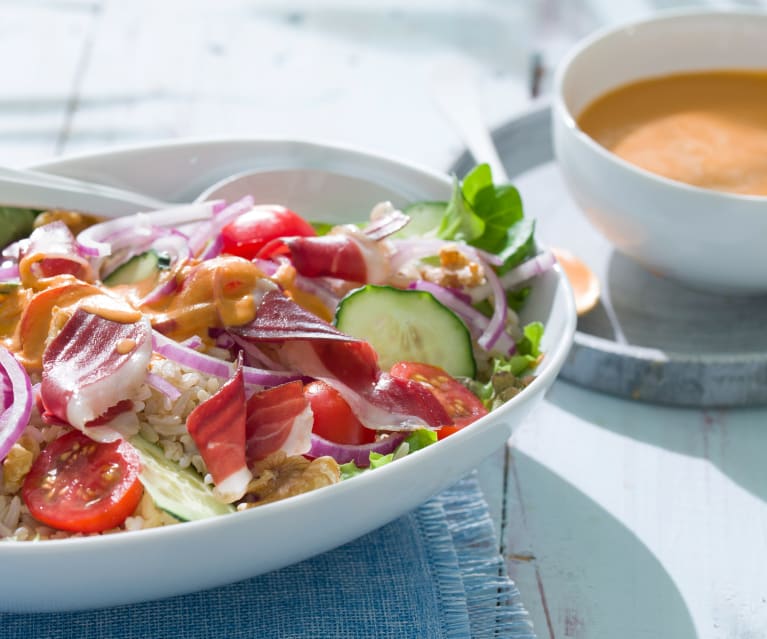 Ponga en una ensaladera las hojas verdes de ensalada y añada el arroz escurrido y frío. Decore con los tomates cherrys, el pepino, la cebolla, el jamón de pato y las nueces. Sirva con el aliño de gazpacho.