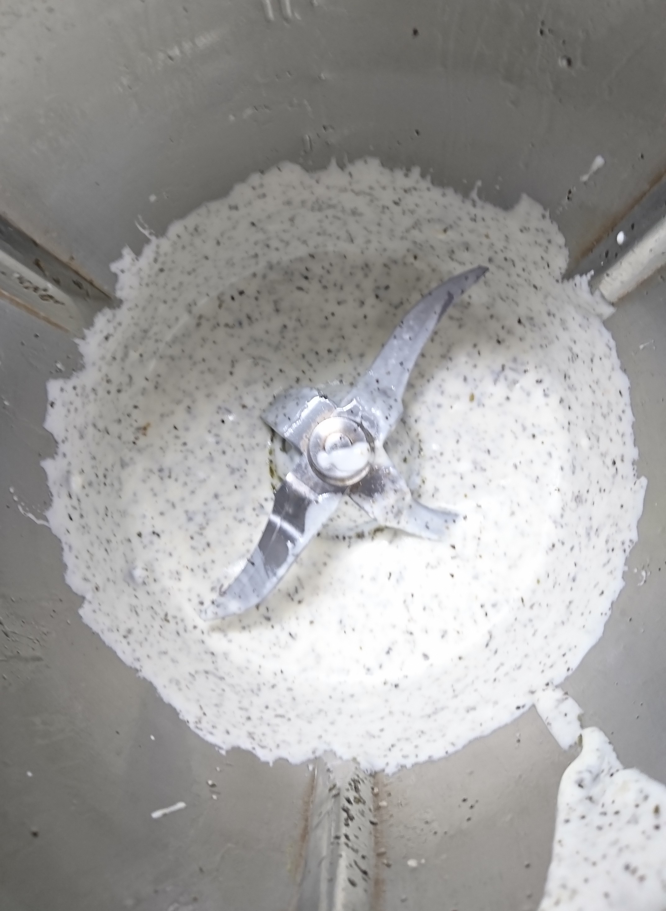 Ponemos en el vaso el diente de ajo y la hierbabuena, la sal y la pimienta y trituramos 10 seg / vel 10.
