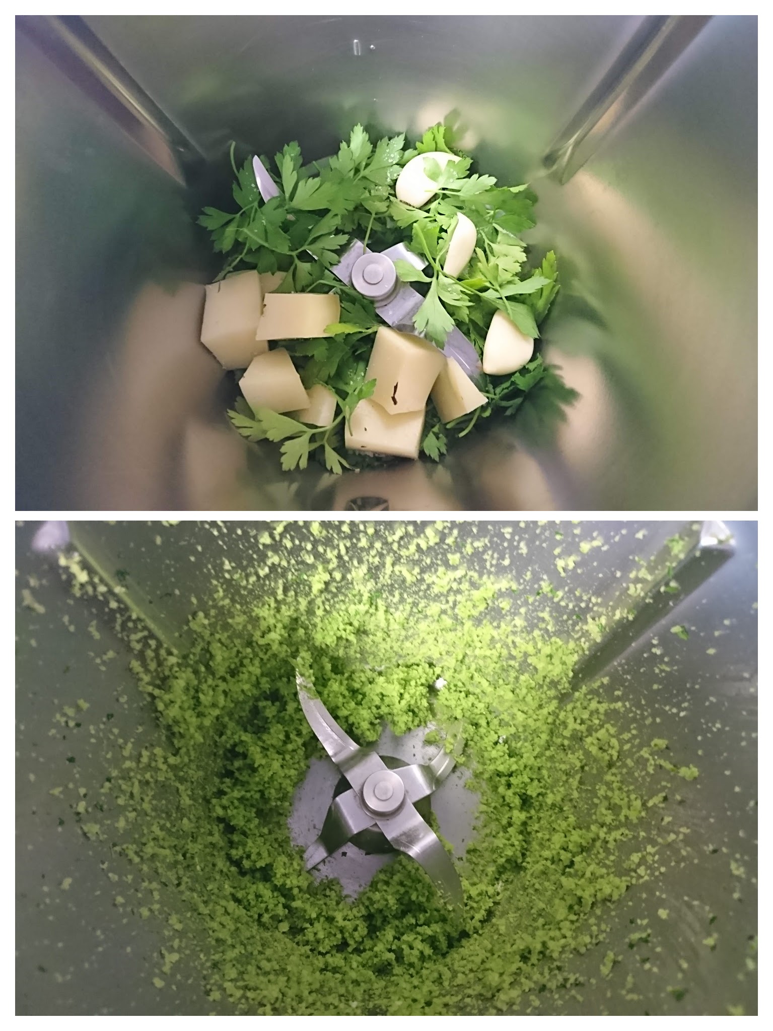 Ponemos en el vaso las hojas de perejil, los dientes de ajo, la sal y los dados de queso y trituramos 7 seg / vel 8. Bajamos con la espátula los ingredientes al fondo y volvemos a triturar 2 seg / vel 8. Pasamos a un bol pequeño y reservamos.