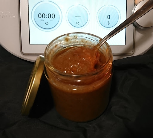 4- Con la espátula bajamos la pasta de la tapa y las paredes y programamos 30 seg / vel 10. Envasamos en un tarro, dejamos terminar de enfriar, tapamos y utilizamos a conveniencia. Conservar en la nevera.
