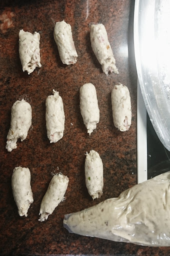 6- Incorporar el pollo desmenuzado restante y el jamón y mezclar bien con la espátula. Verter la masa en una manga pastelera (o en una fuente humedecida) y dejar templar y reposar en el frigorífico durante aprox. 4 horas.