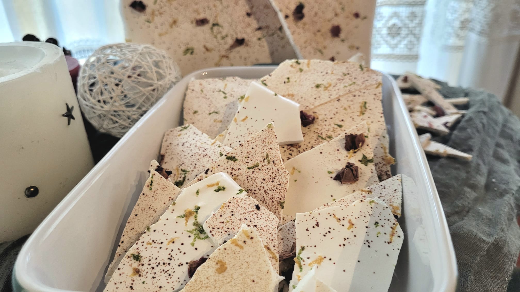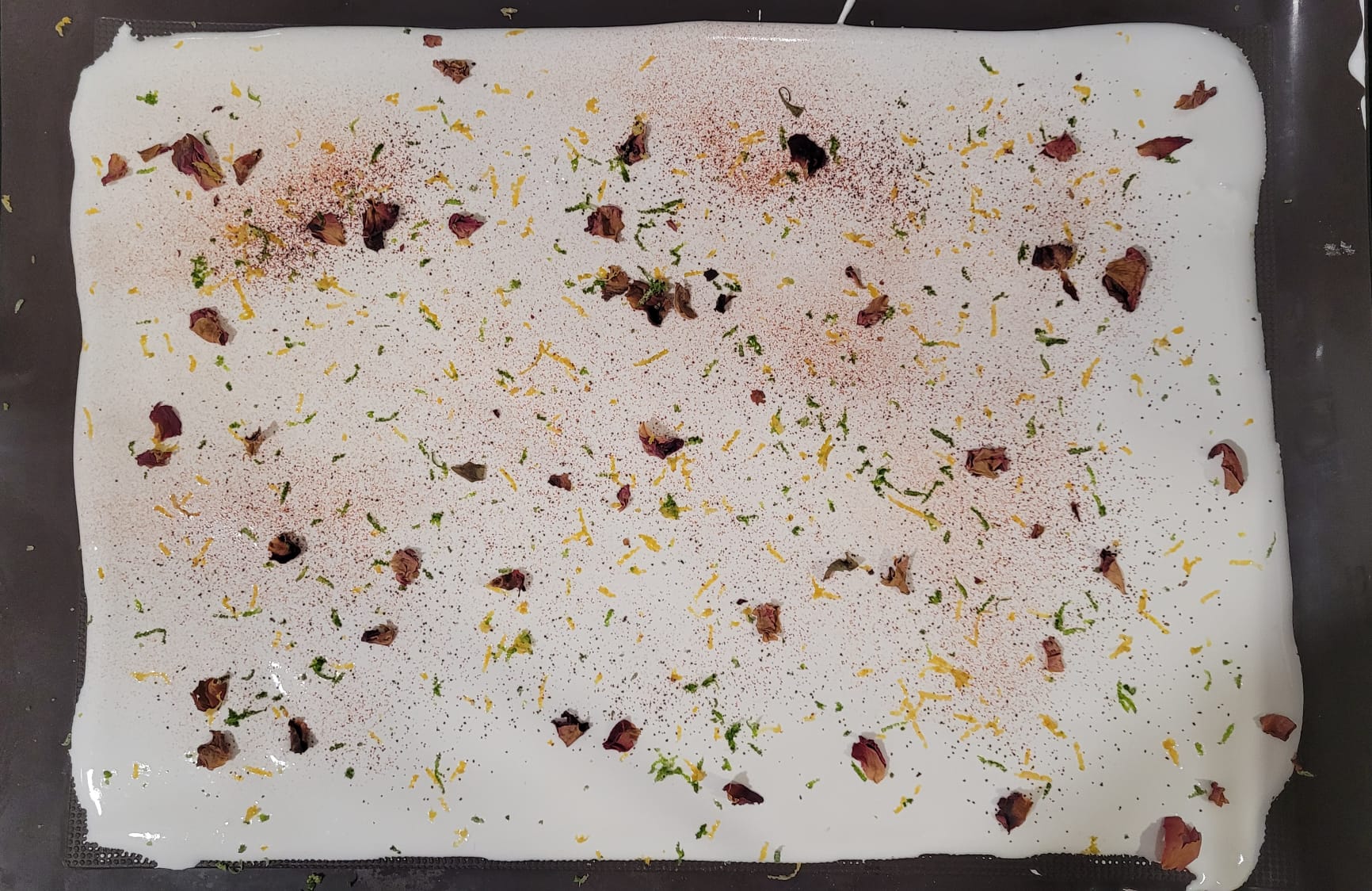 Para las notas de color en la placa base, un sencillo merengue francés, casinos sirve cualquier ingrediente que las aporte, polvos de frutas deshidratadas o liofilizadas, ralladuras de cáscaras de cítricos, pétalos secos de flores, especias..., en la lista de ingredientes pongo los que yo he usado, pero vuestra inspiración, aquí, es la reina.