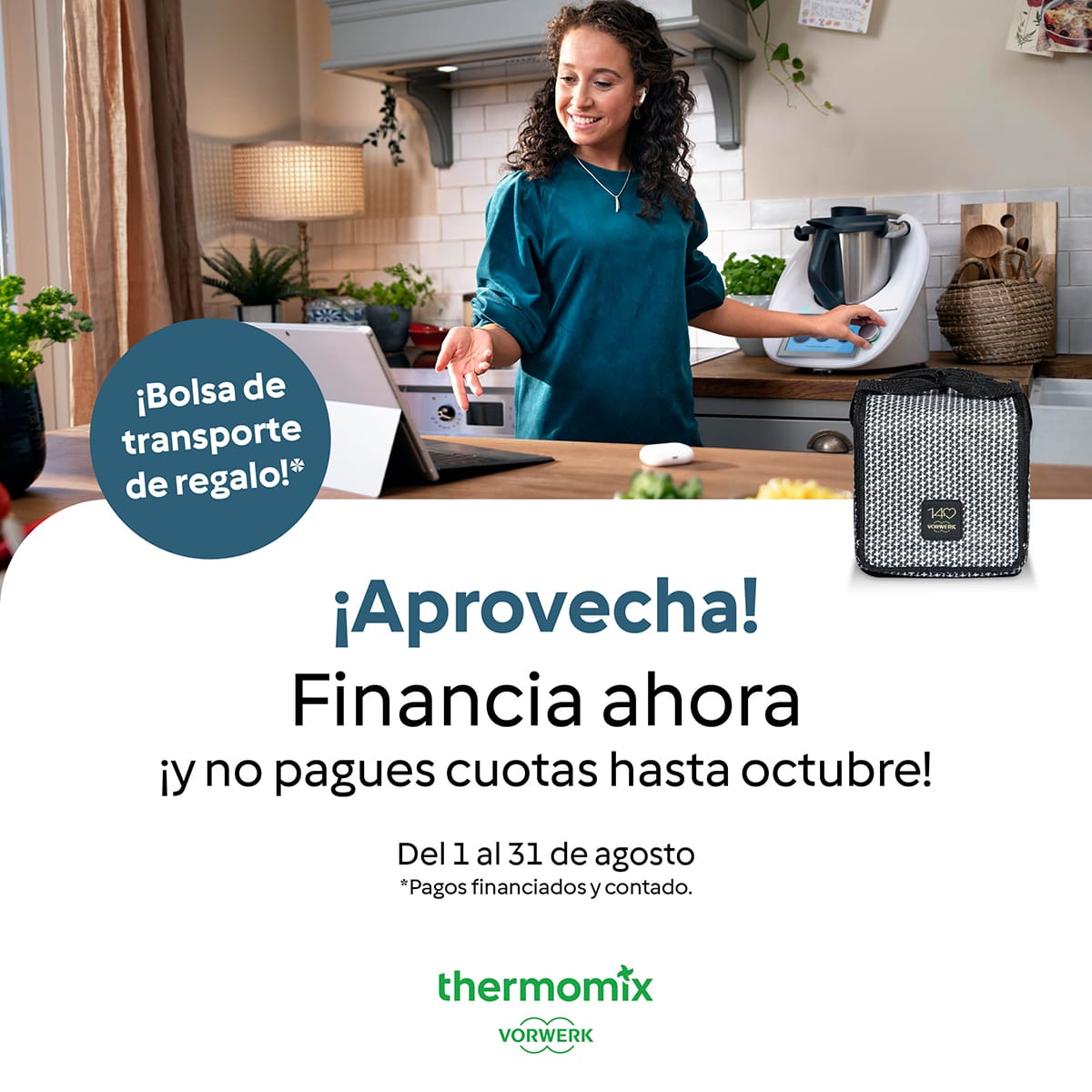 Y para poder empezar ya ahora podemos tenerlo en casa y NO PAGAR hasta octubre ¿te lo puedes creer? pues no sólo eso, por si quieres llevártelo a tu destino de vacaciones, tendrás de regalo con tu Thermomix la bolsa de transporte exclusiva del 140 Aniversario.