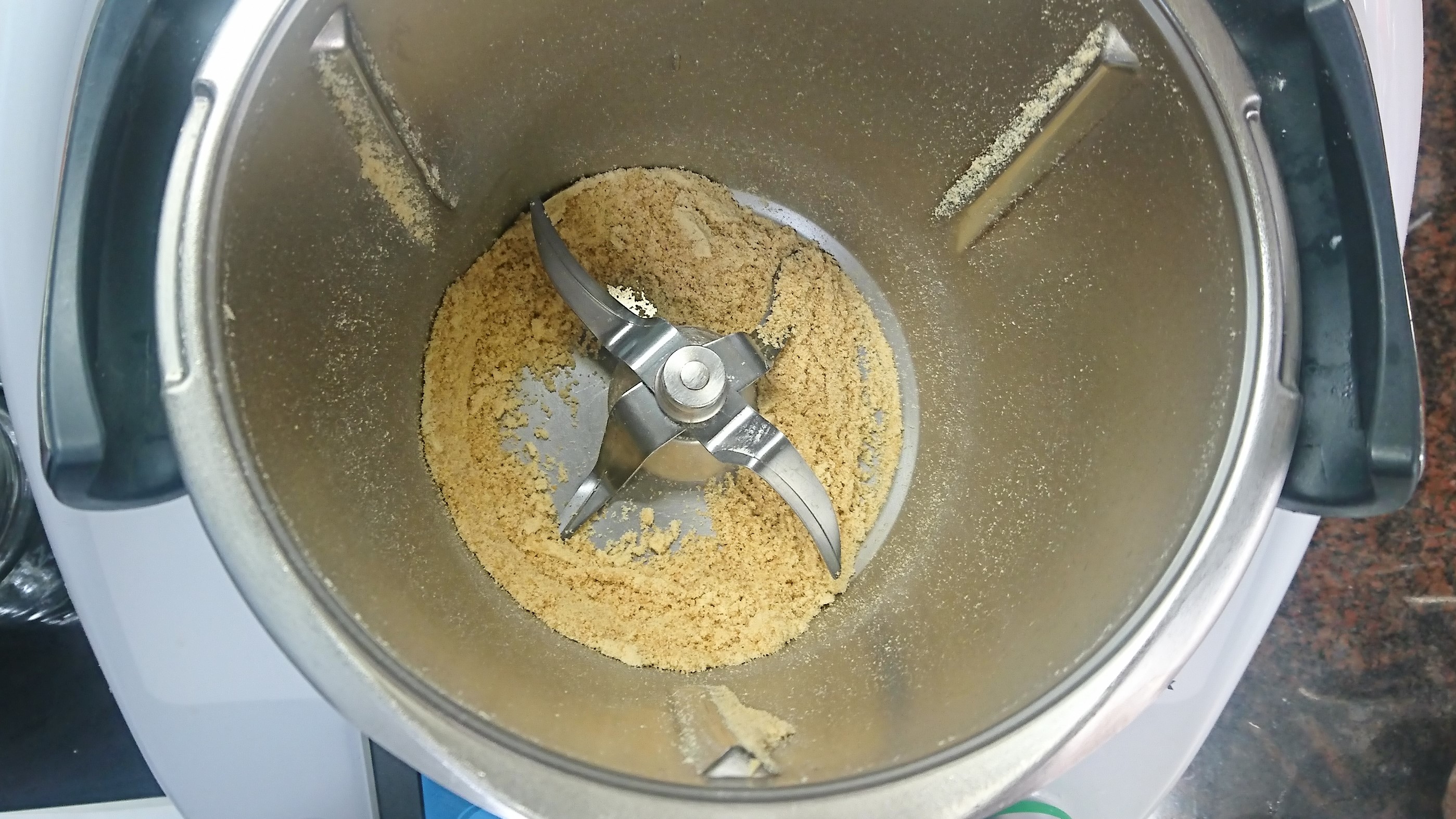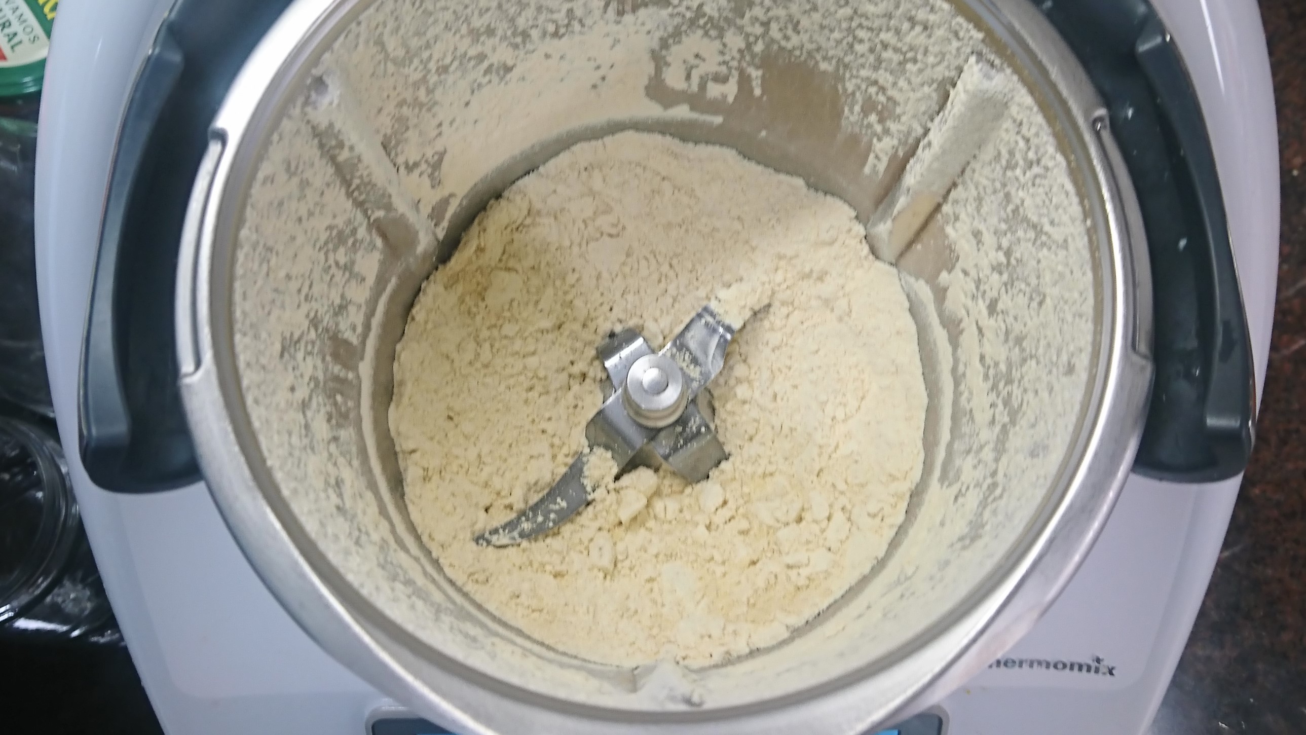 1- Molemos las semillas de lino 15 seg / vel 10. Añadimos el agua y mezclamos 1 min / vel 3. Pasamos a un bol y dejamos reposar 15 minutos en la nevera.