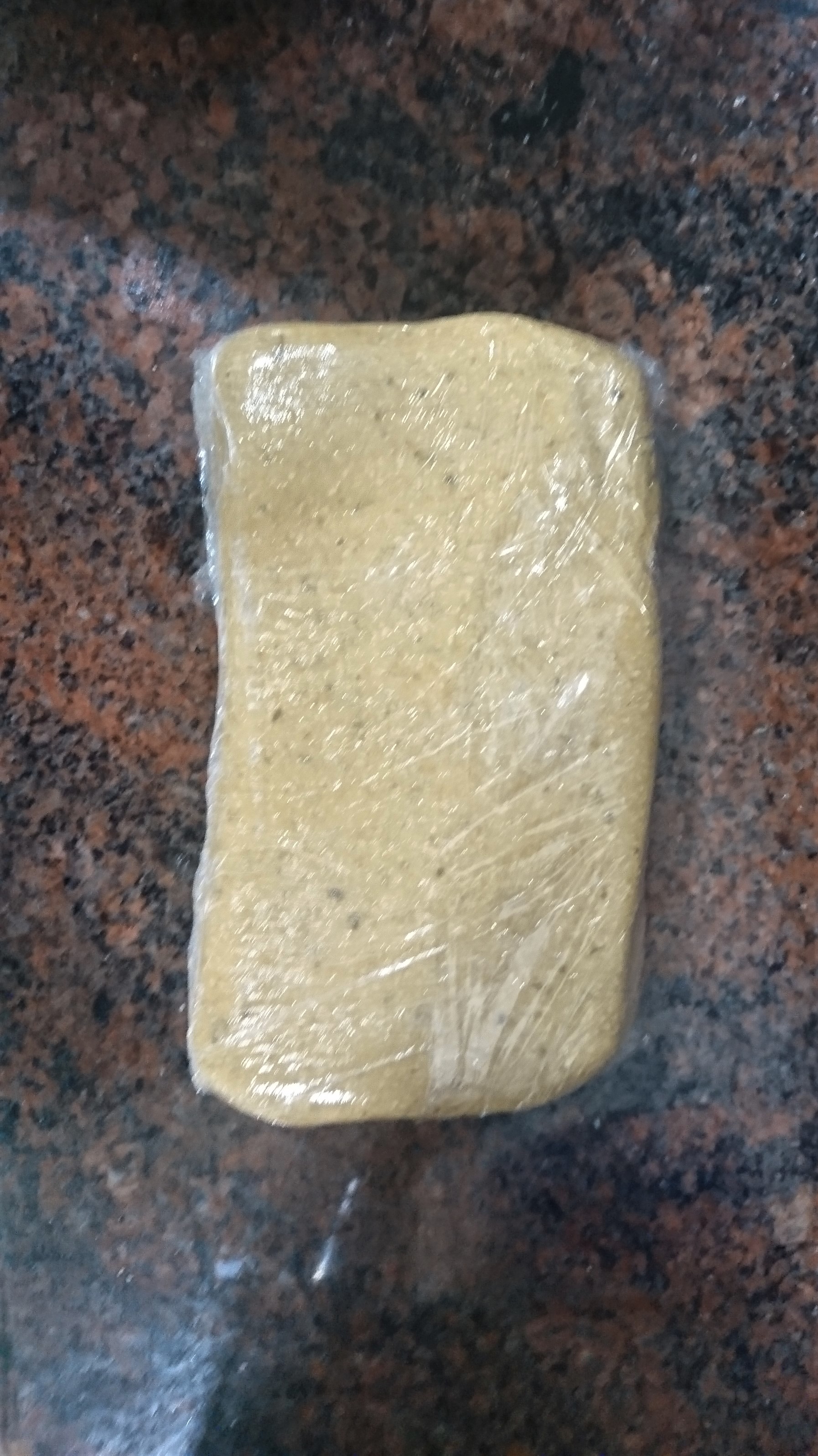 2- Ponemos en el vaso la harina de garbanzos, echamos el lino reservado y mezclamos 30 seg / vel 2. Después amasamos 2 min / Función "Amasar" (espiga). Retiramos la masa del vaso, la compactamos y envolvemos en film dándole forma rectangular con un grosor de 1 cm aprox. y dejamos reposar 30 minutos a temperatura ambiente.