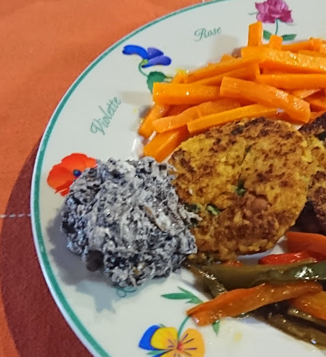 Servimos las tortitas guarnecidas con las zanahorias y los pimientos y con una bola o quenefa de la "stracciatella" de champiñones.