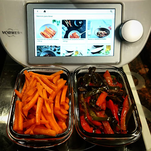 Para la guarnición he preparado las zanahorias doradas, el pimiento rojo dorado y los champiñones dorados que tenemos en el recetario de Cookidoo "Básicos para dorar". Las he preparados las tres seguidas, sin lavar el vaso entre una y otra, en el orden nombrado