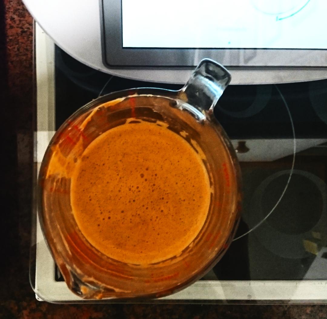 3- Pasar todo el contenido del vaso a un colador chino colocado sobre un recipiente en el que recoger todo el concentrado que extraeremos presionando con la mano del chino.