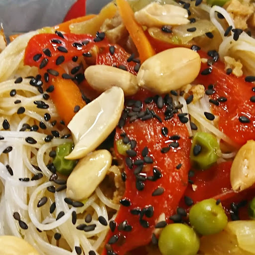 BOL DE FIDEOS DE ARROZ CON SALTEADO DE VERDURAS Y CACAHUETES