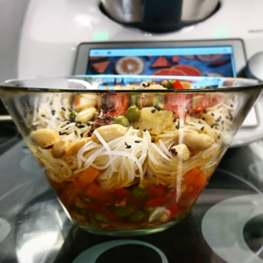 Y con todas estas ventajas y alguna más hemos preparado este "Bol de fideos de arroz con verduras salteadas y cacahuetes", delicioso, nutritivo, ligero y vegano, una receta para elaborar al 100% con Thermomix® que funciona perfectamente como plato único... ¿quieres prepararlo con Thermomix®? Pues pídeme información, sin compromiso, te enseñaré todo lo que el TM6 puede hacer por y para ti. No dejes pasar la oportunidad, no te cuesta nada.