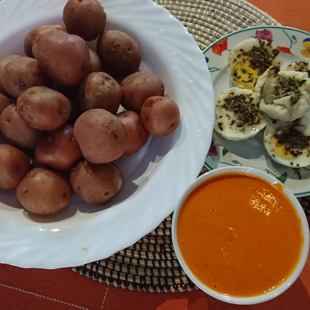Servimos inmediatamente las patatas con los huevos y el mojo aparte en un bol para que cada cual se sirva.