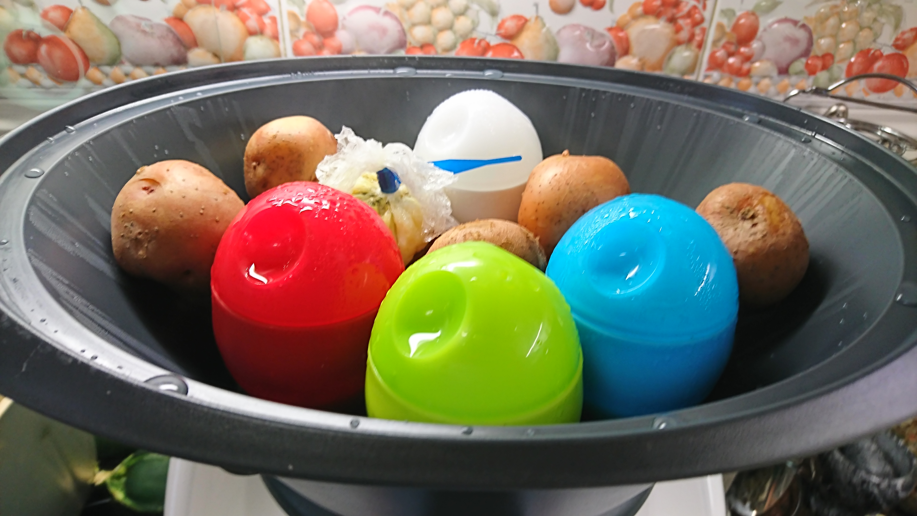 En cuatro cocotes o en cuatro paquetitos de film de cocina (cortamos cuatro cuadrados y los introducimos en cuatro flaneras) aceitadas cascamos los huevos y espolvoreamos con sal, pimienta y orégano, y tapamos o cerramos bien. Las colocamos en el varoma junto a las patatas y ponemos la tapa. Programamos 45 min / varoma / vel 2. A mitad del tiempo pararemos un momento para retirar los huevos y continuaremos con la cocción.