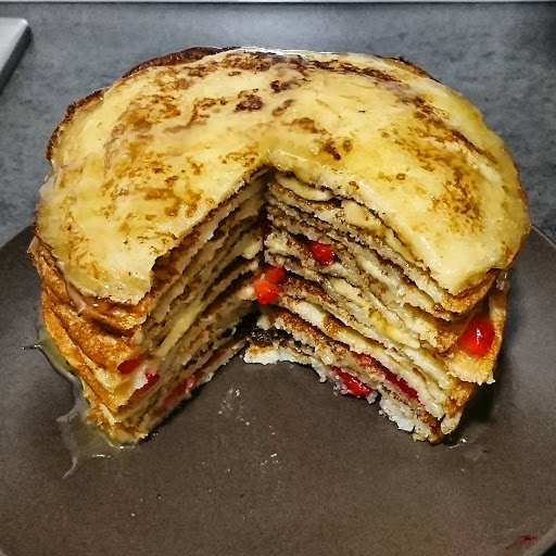 4- Montaje: Formar una torre con las tortitas, intercalando la fruta o el relleno elegido y regar con miel, sirope , etc. Servir inmediatamente.