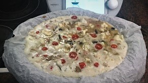 5- Repartir la mezcla de berenjena y cebolla con la espátula por toda la bandeja del varoma y mezclar un poco , suavemente, con el huevo. Repartir los tomates cherry cortados por la mitad y el queso azul en daditos.