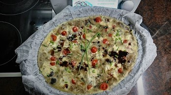 8- Servir en una fuente ovalada o directamente con la bandeja del Varoma, regada con crema balsámica al gusto y decorada con un poco de cebollino picado. Cortar en 6 porciones y disfrutar acompañada de lo que más nos apetezca.