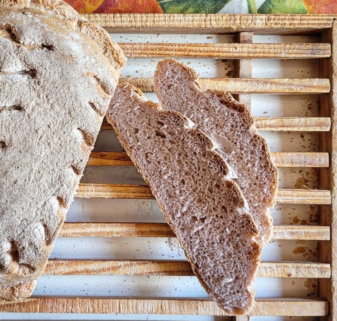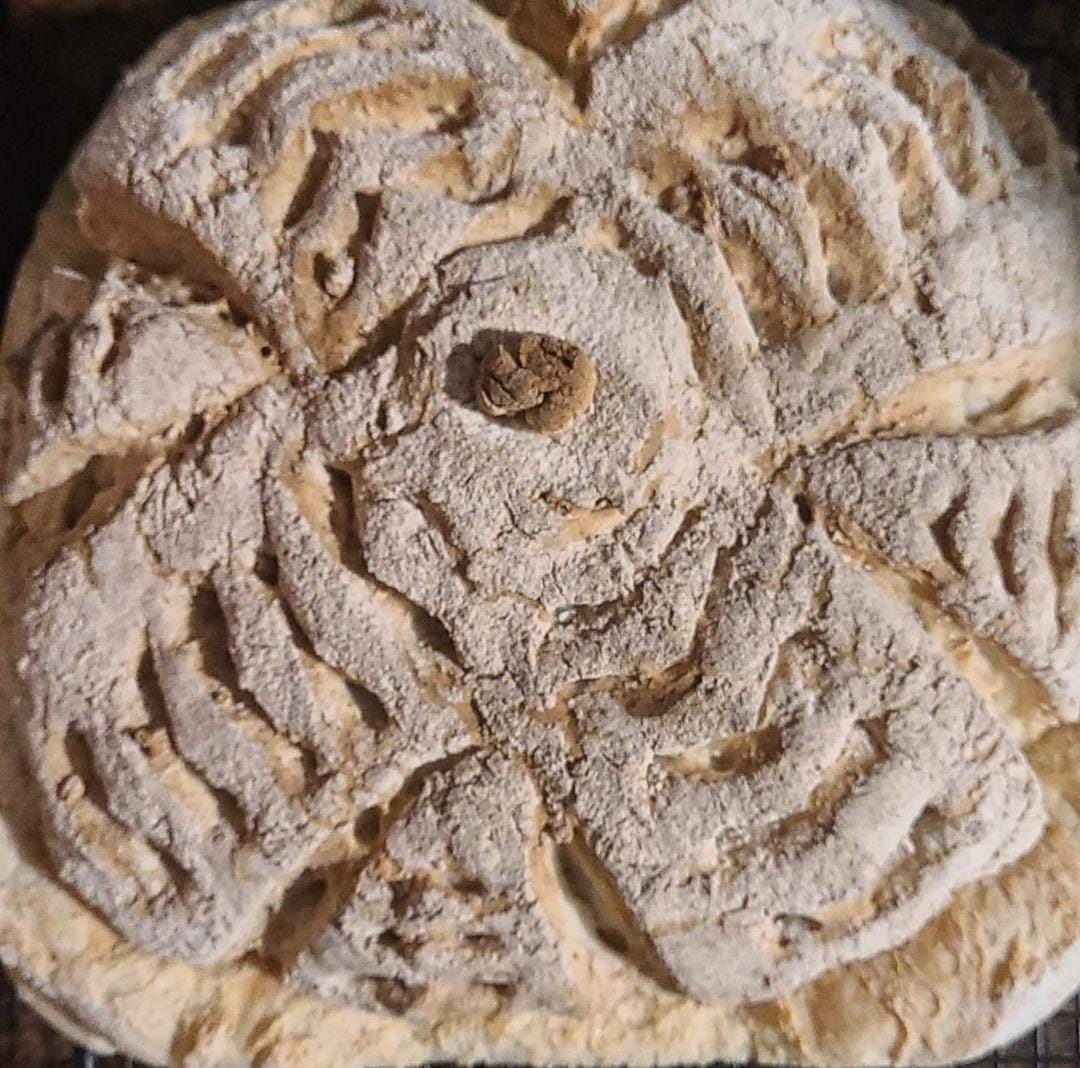 6- Calentar el horno a 200 ºC. Con unas tijeras o un cuchillo bien afilado hacer los cortes al pan (greñado) y espolvorear con un poco de harina de trigo rarraceno. Poner en el horno, cerrar, bajar temperatura a 180 ºC y hornear 35-40 minutos.