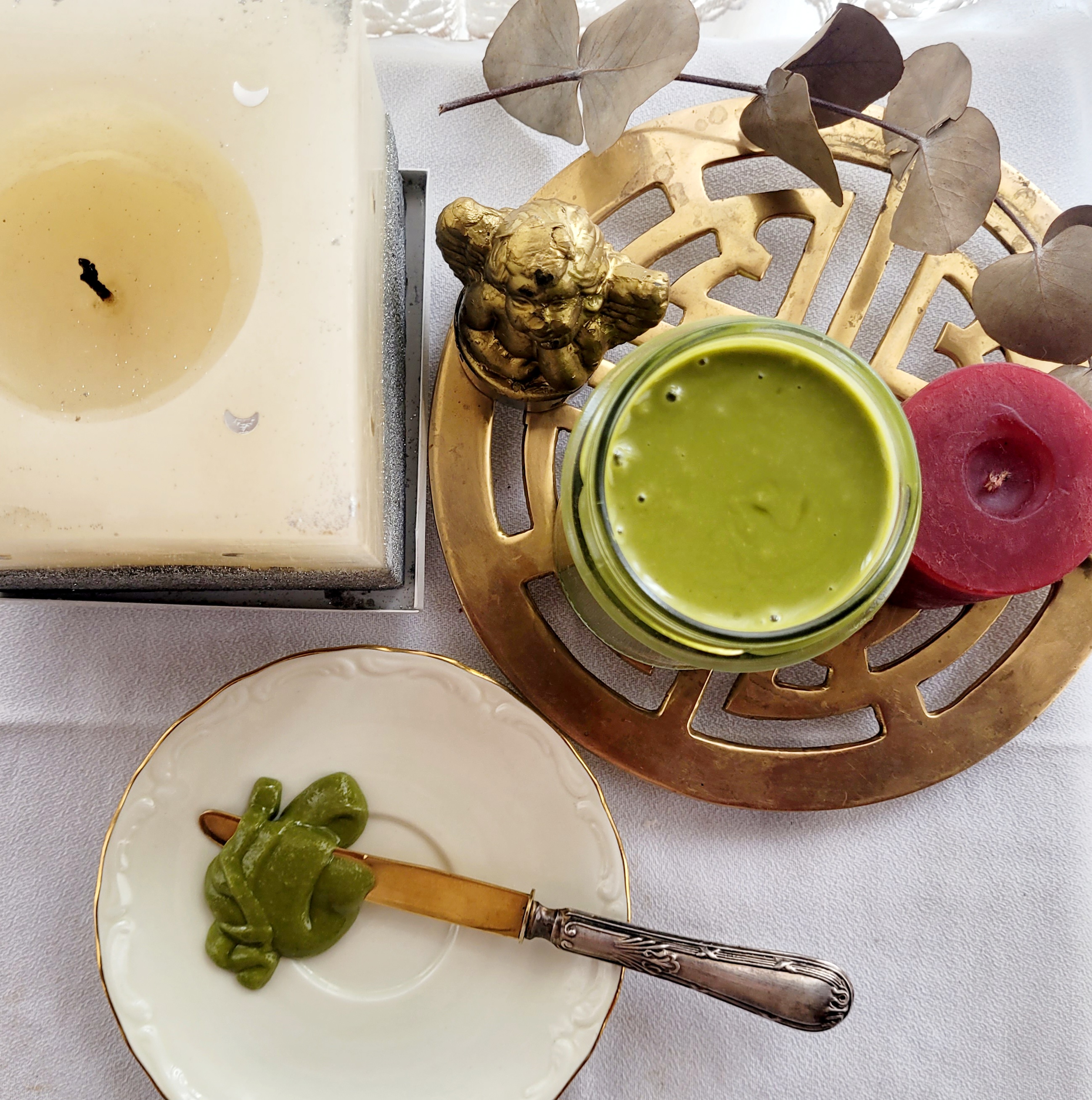 La crema de almendras con té Matcha suma, además, los beneficios de este té que a nivel de nutrientes aporta una gran variedad de vitaminas A, B2, C, D, E, K, minerales: potasio, calcio, hierro, proteínas, clorofila y antioxidantes componentes que protegen contra los dañinos radicales libres responsables del envejecimiento y deterioro de los tejidos. Su concentración de L-Teanina y Cafeína, mejora de la eficiencia neuronal y física.