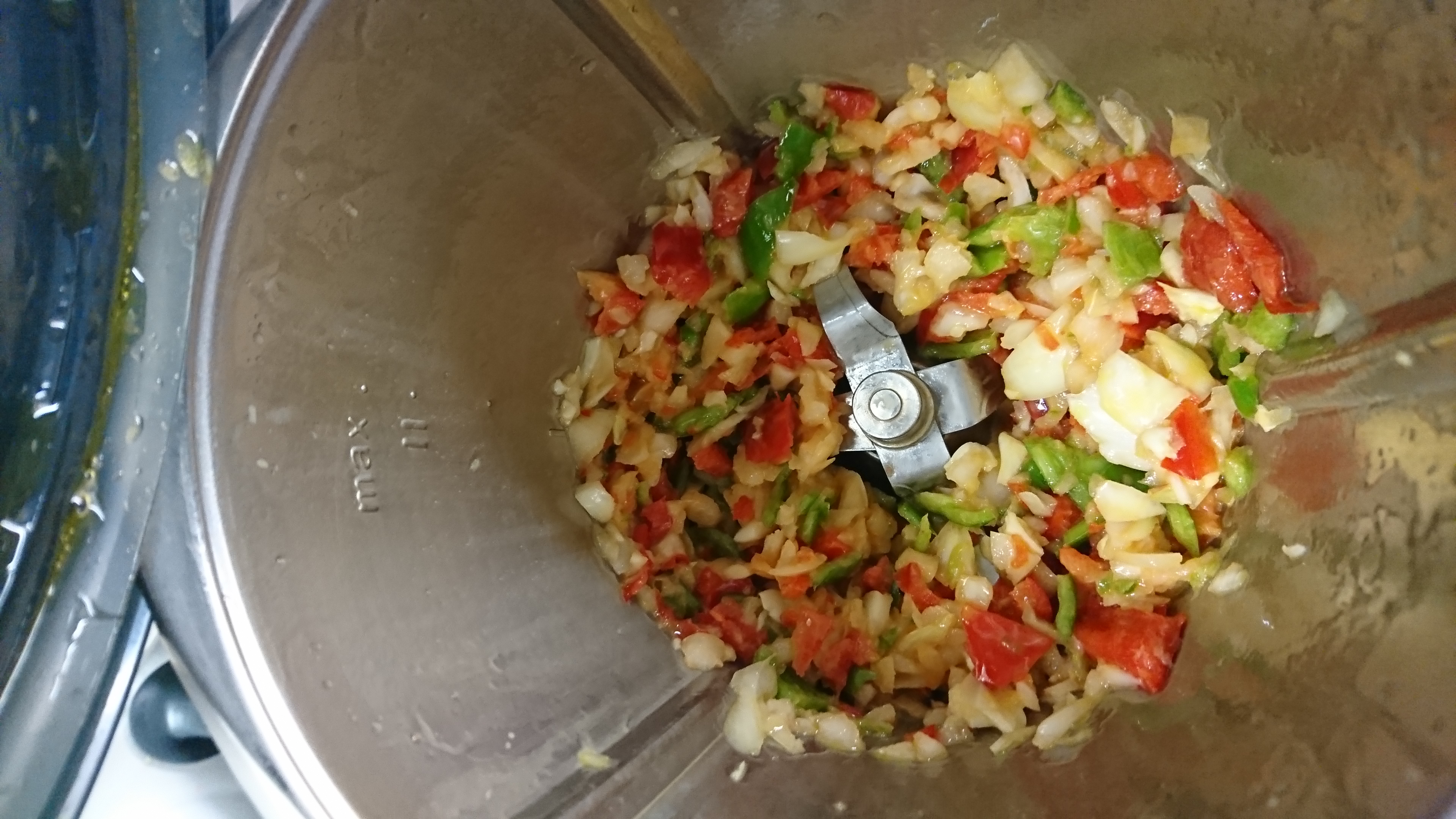 Echamos la cebolla, los pimientos, los dientes de ajo y el aceite en el vaso y troceamos 4 seg / vel 4. programamos 8 min / 120º / Giro inverso / vel. cuchara.