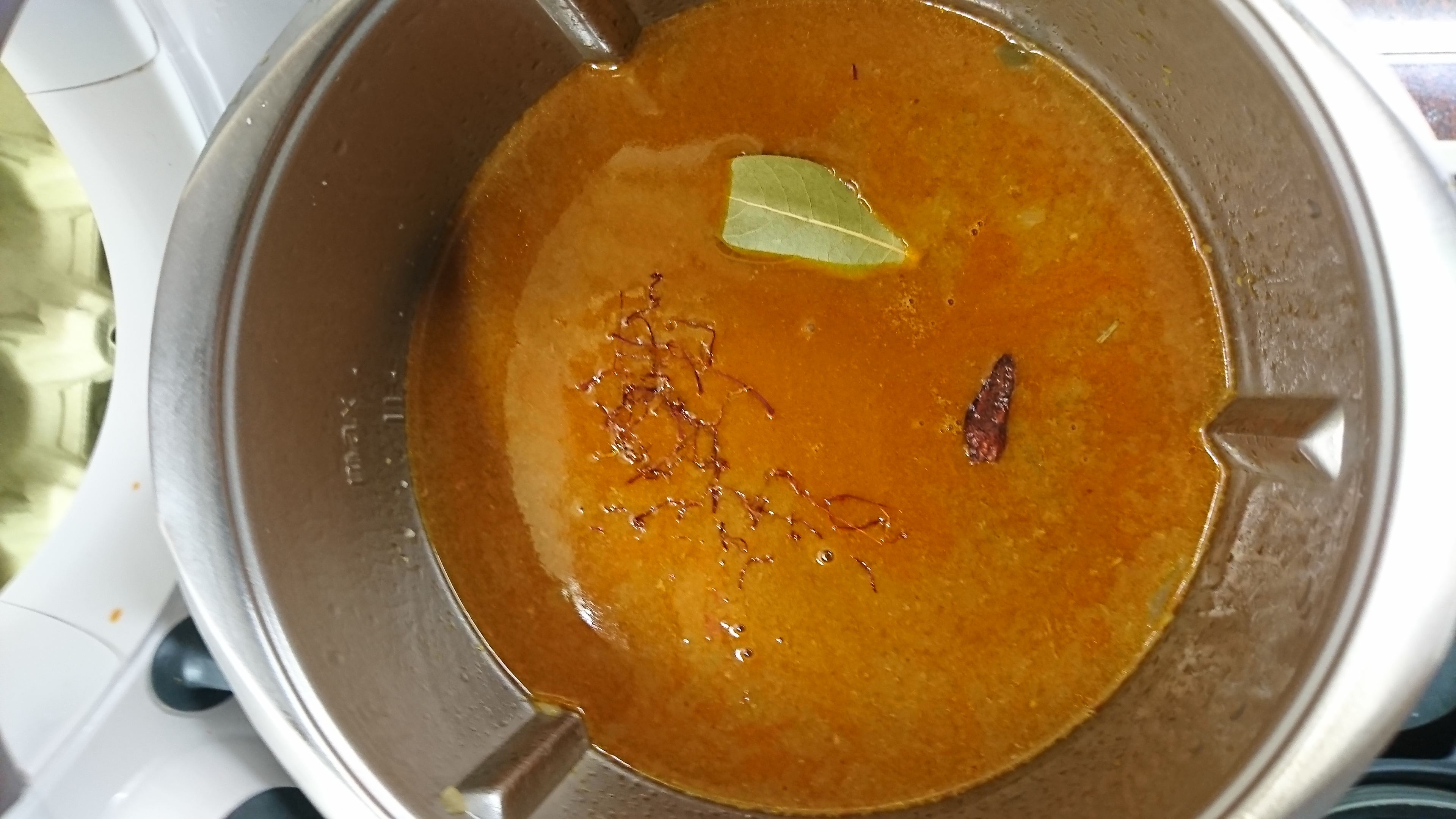 Agregamos el caldo, las hebras de azafrán, el laurel la sal y la cayena y calentamos 10 min / 100º / Giro inverso / vel 1.