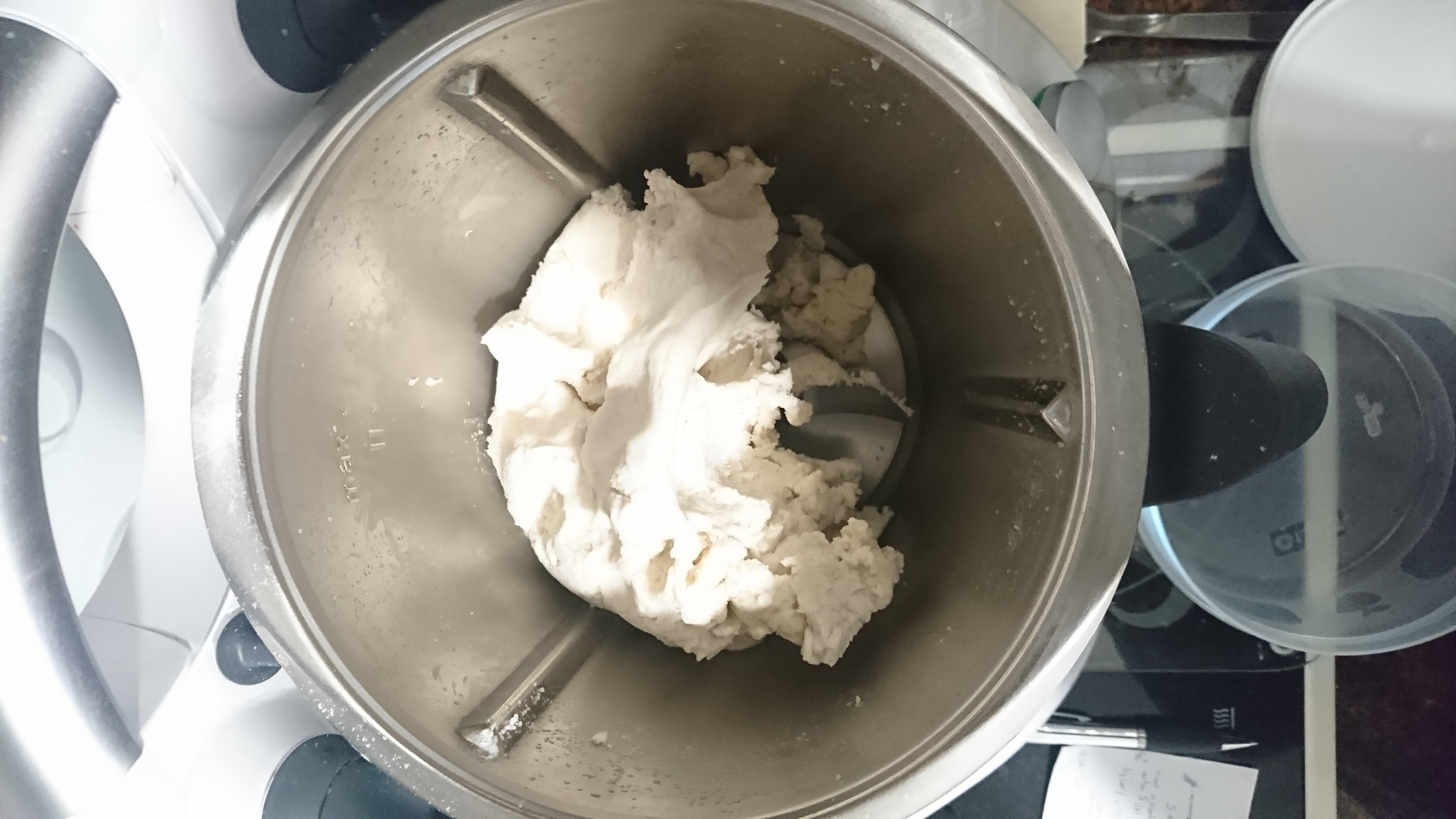 3. Ponemos en marcha a velocidad 3 y vamos añadiendo el agua poco a poco. Cuando esté toda el agua incorporada programamos 2 min / vel 5 y después amasamos 2 min / vel Espiga.