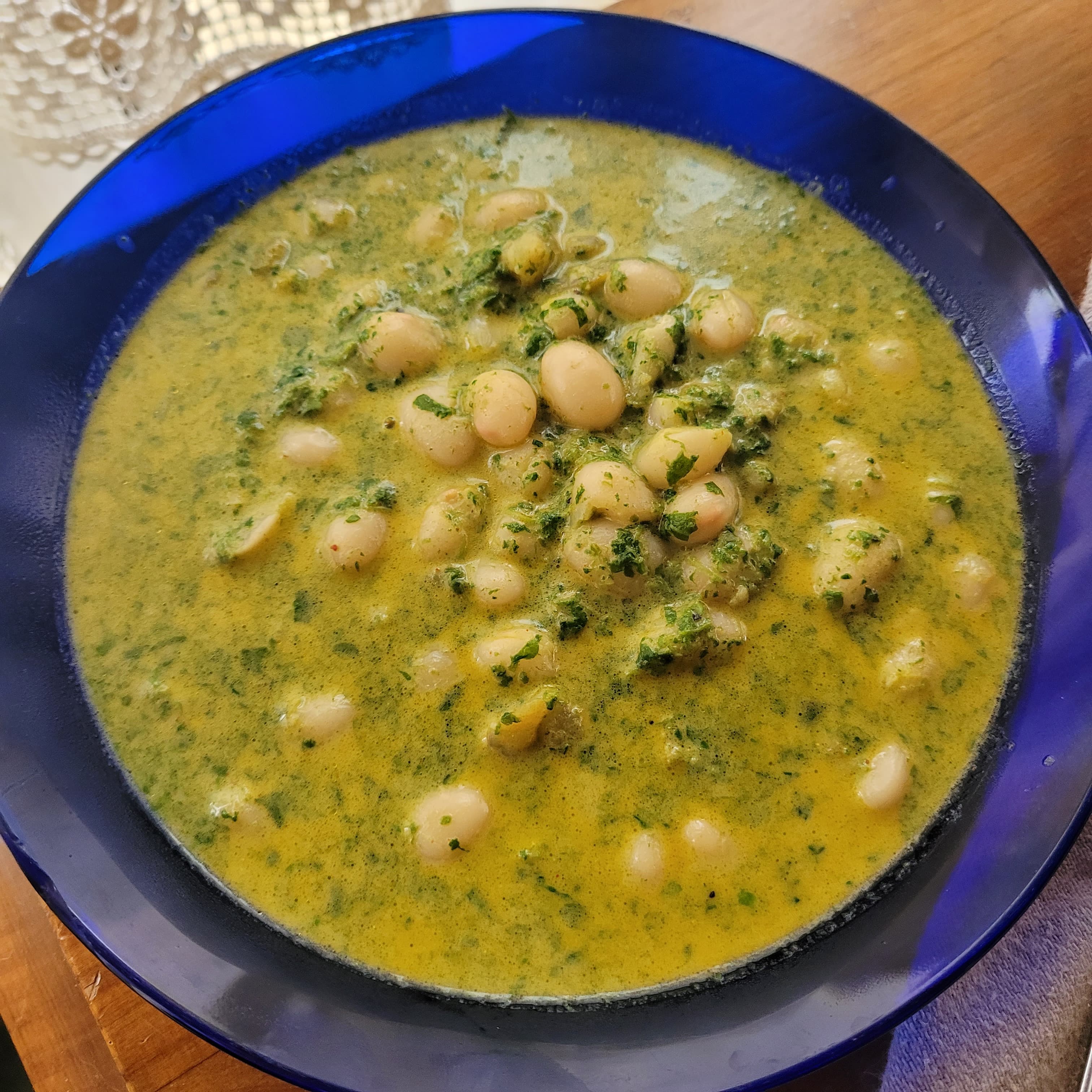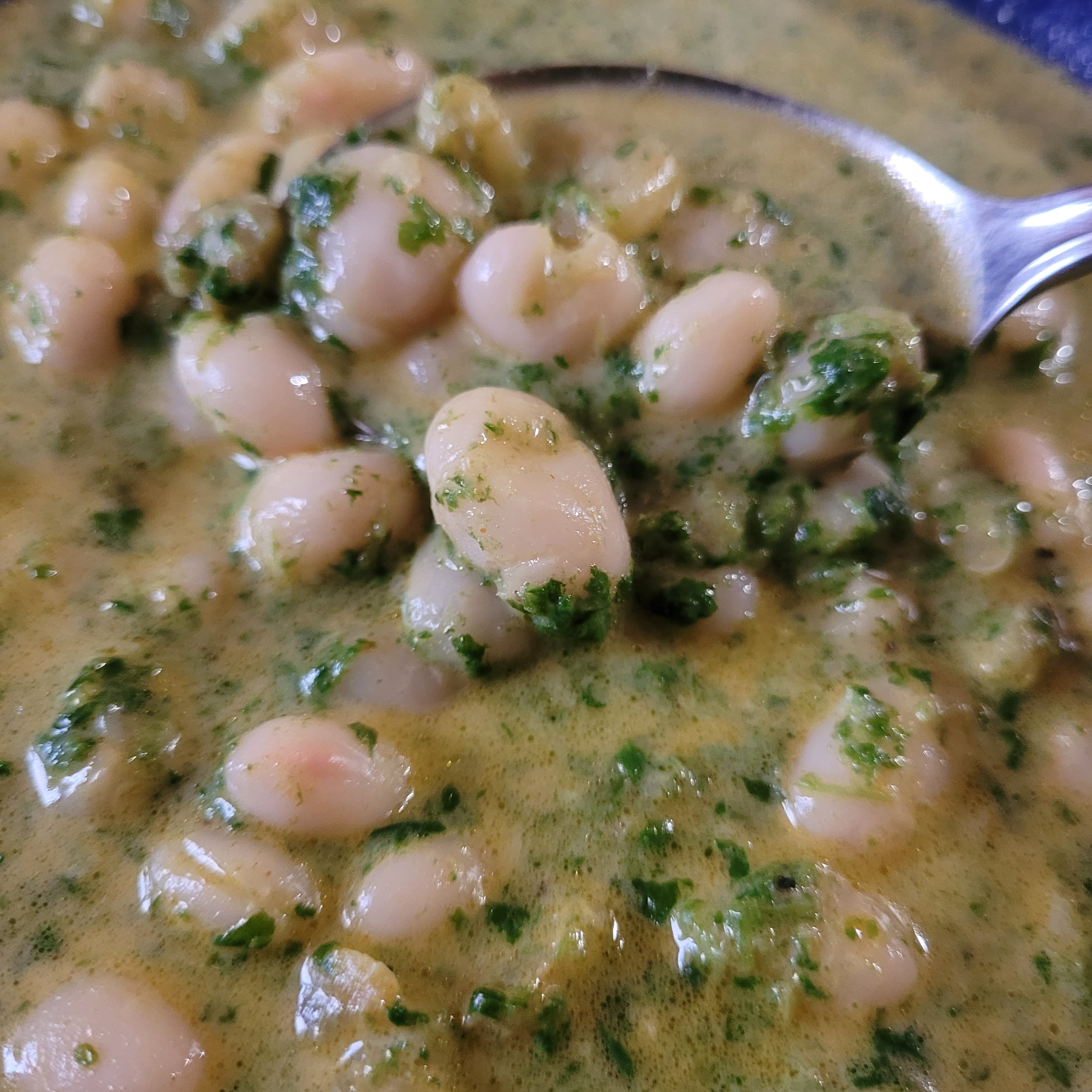 Receta de cuchara con Thermomix. Judías blancas con espinacas y gambitas al azafrán.