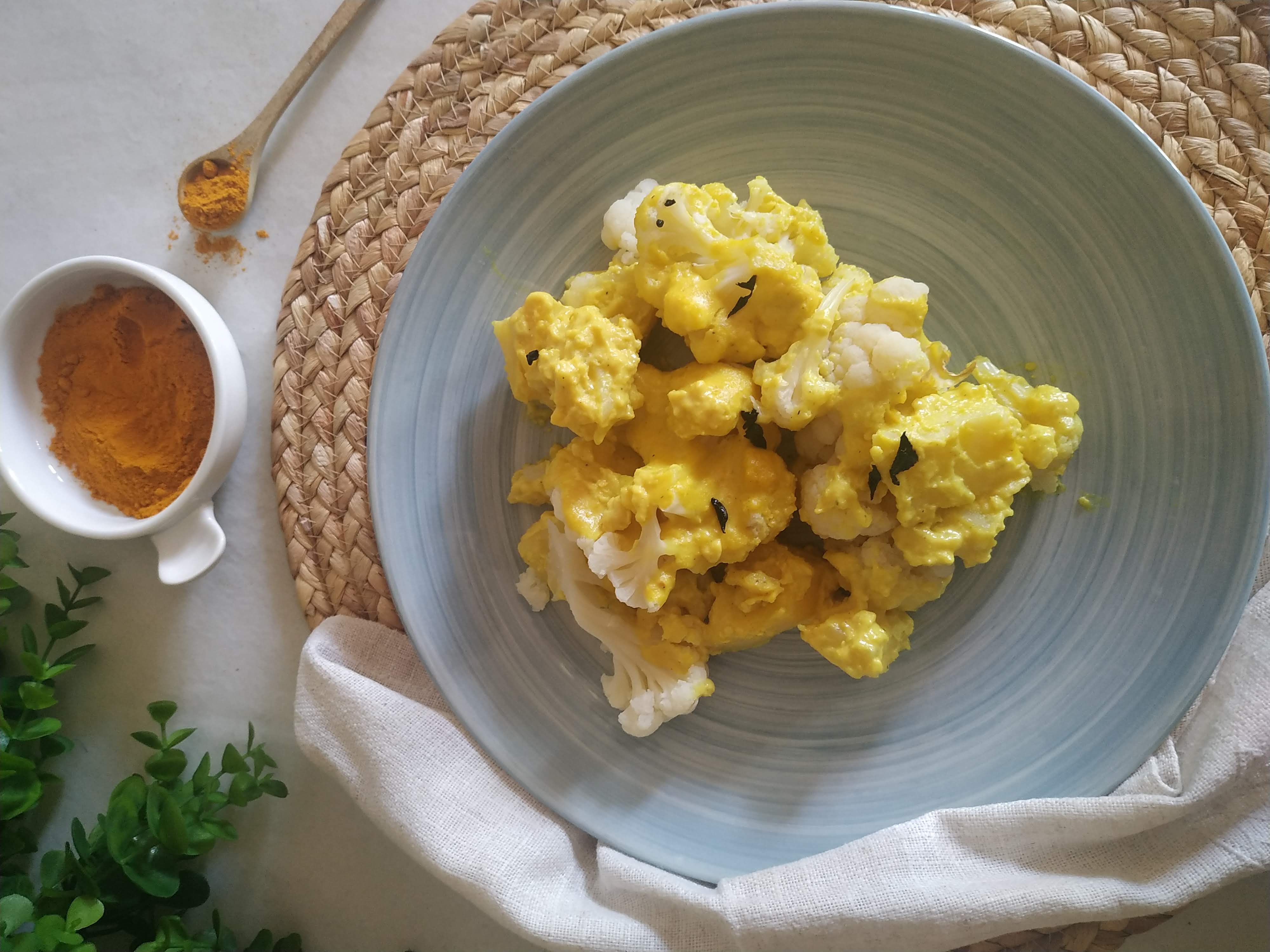 Coliflor y patatas y salsa de bechamel con cúrcuma sin gluten, sin lactosa