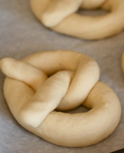 Para formar los bretzel sujete el cordón por cada extremo formando una U, cruce los extremos entre sí dos veces formando un cordón doble retorcido y lleve las puntas separadas al centro del cordón. Coloque los bretzels en la bandeja para hornear forrada. - Inmersión y horneado