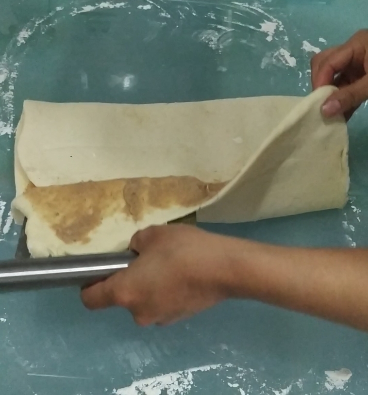 - Doble el tercio inferior de la masa hacia arriba para cubrir el tercio medio y el tercio superior como un tríptico. estirar de nuevo formando un rectángulo del mismo tamaño 50 cm x 26cm.