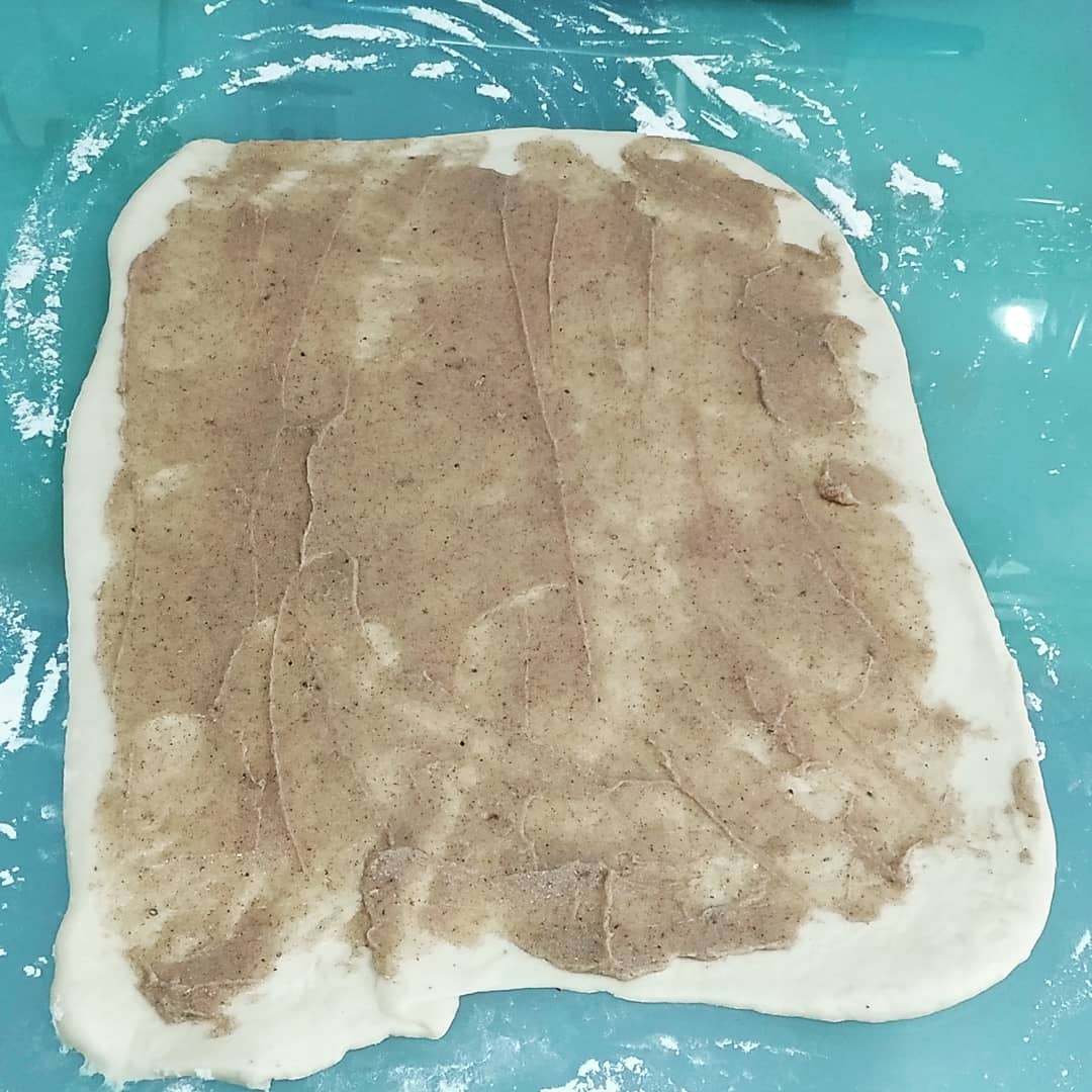 - Una vez que la masa haya duplicado su tamaño, colóquela sobre una superficie ligeramente enharinada. Enrolle en un rectángulo (50 cm x 26 cm) y luego incorpore el relleno encima.