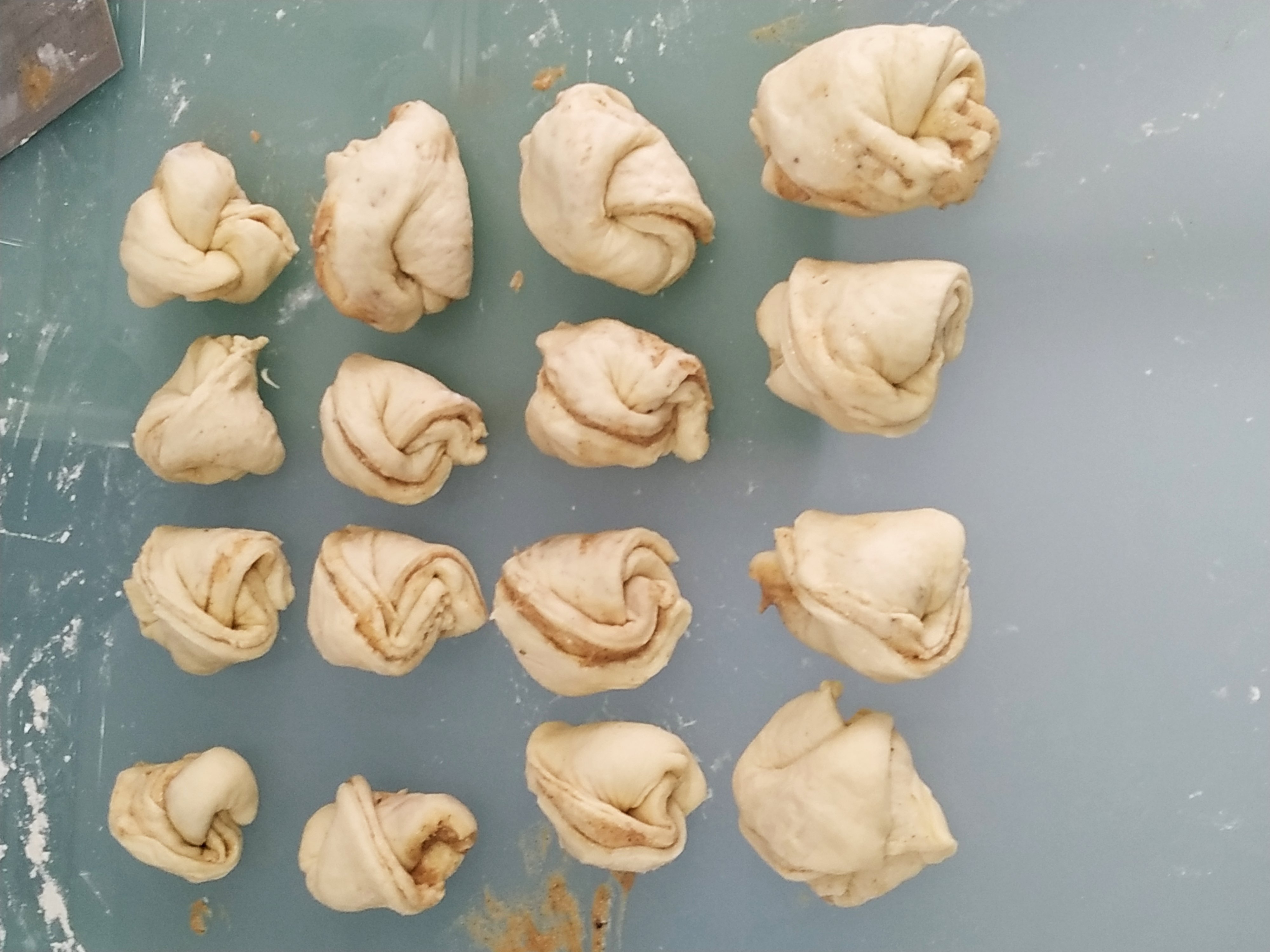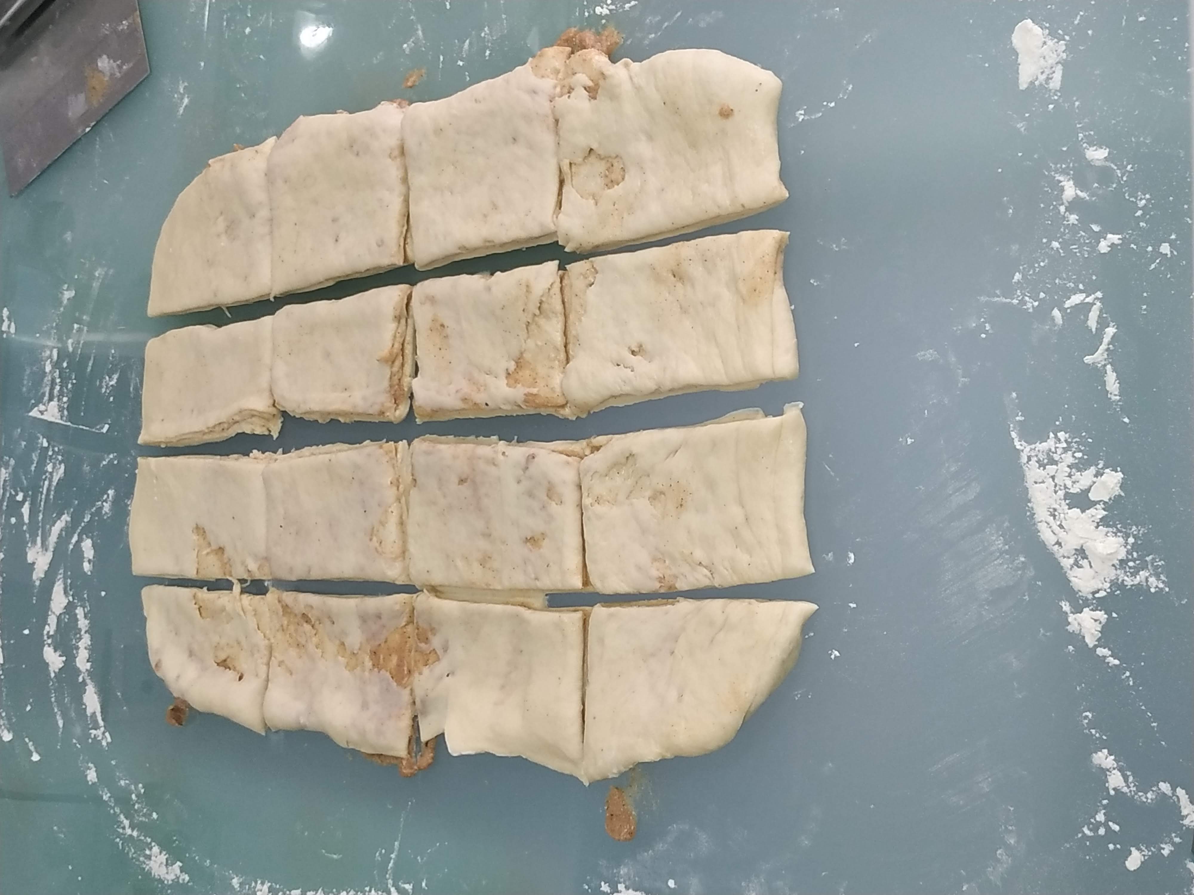 Corte en mitad luego en 4 así hasta conseguir 16 rectángulos iguales. Estírelos retorciendo y ocultando debajo las puntas, poner en las bandejas.
