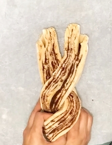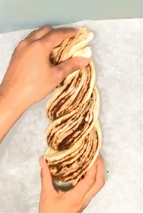 Tome 2 mitades, coge una mitad de masa y crúcela encima de la otra, termine de trenzar la masa intentando mantener los lados cortados hacia afuera para que sean visibles.