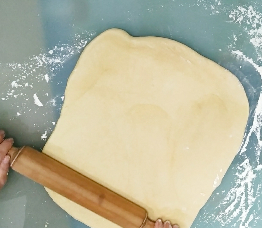 Sobre una superficie plana y ligeramente enharinada estire la masa con un rodillo en un rectángulo de 30 cm x 50 cm, si es necesario espolvoree un poco más de harina.