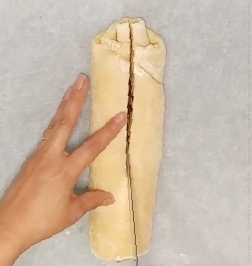Comience a enrollar la masa por la parte más ancha hasta formar un rollo.