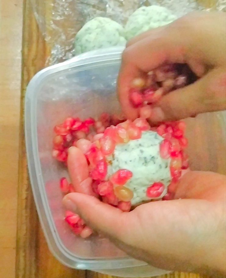 Retire el film transparente y reboce cada bolita de queso en los granos de granada, presionando suavemente para que se adhieran. Póngalos en una bandeja en la nevera hasta la hora de servir.