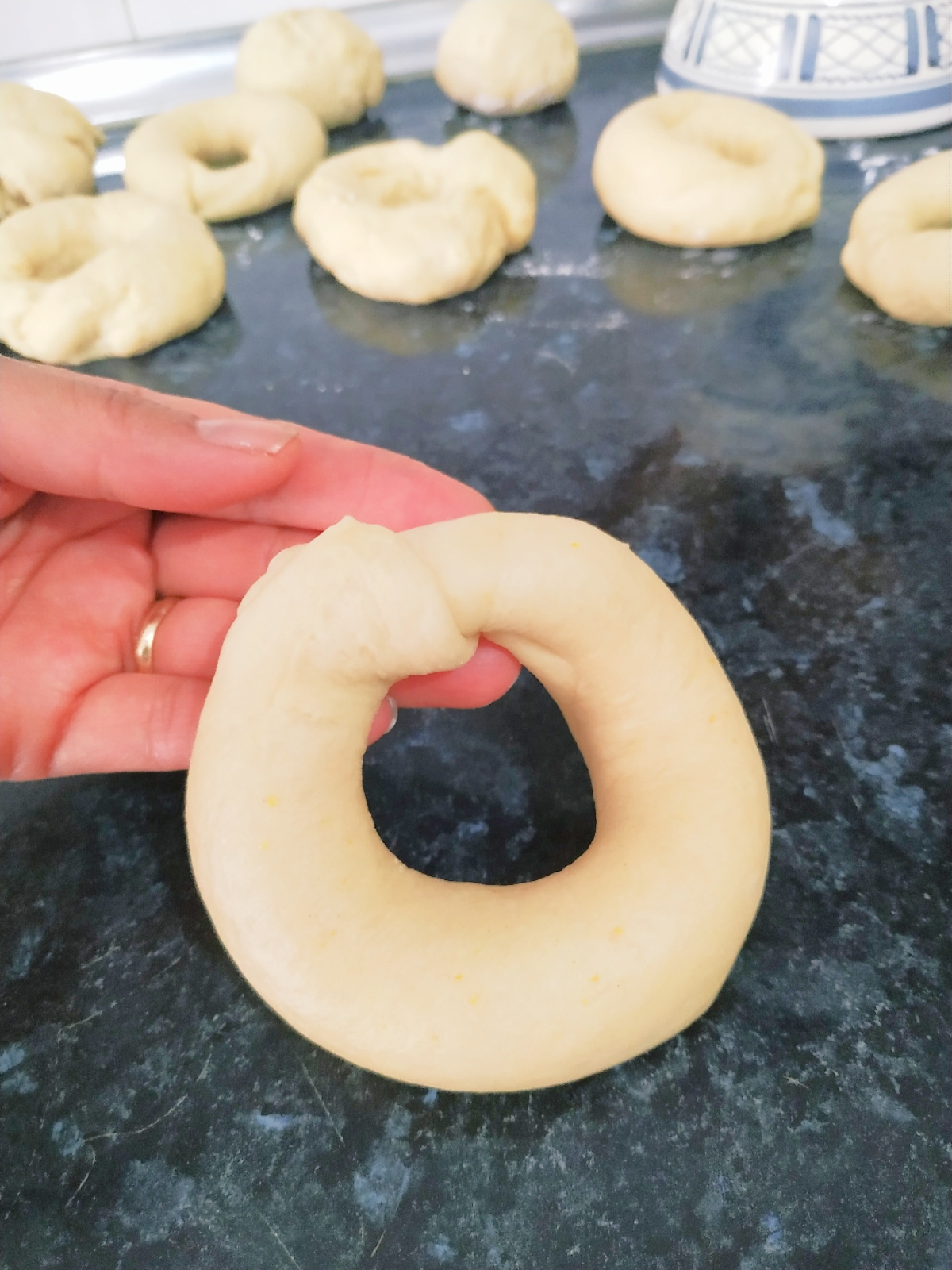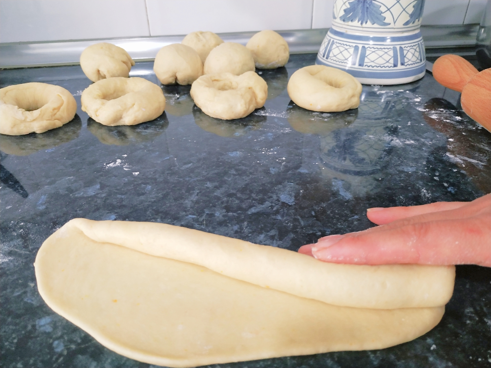 Divida la masa en 12 porciones de aprox. 100 g cada una y deles forma de bola. Luego estire formando aproximadamente un rectángulo, enrrollela y una cada extremo estirando suavemente y cubriendo el otro extremo (es importante que la masa esté fría para que sea más manejable)