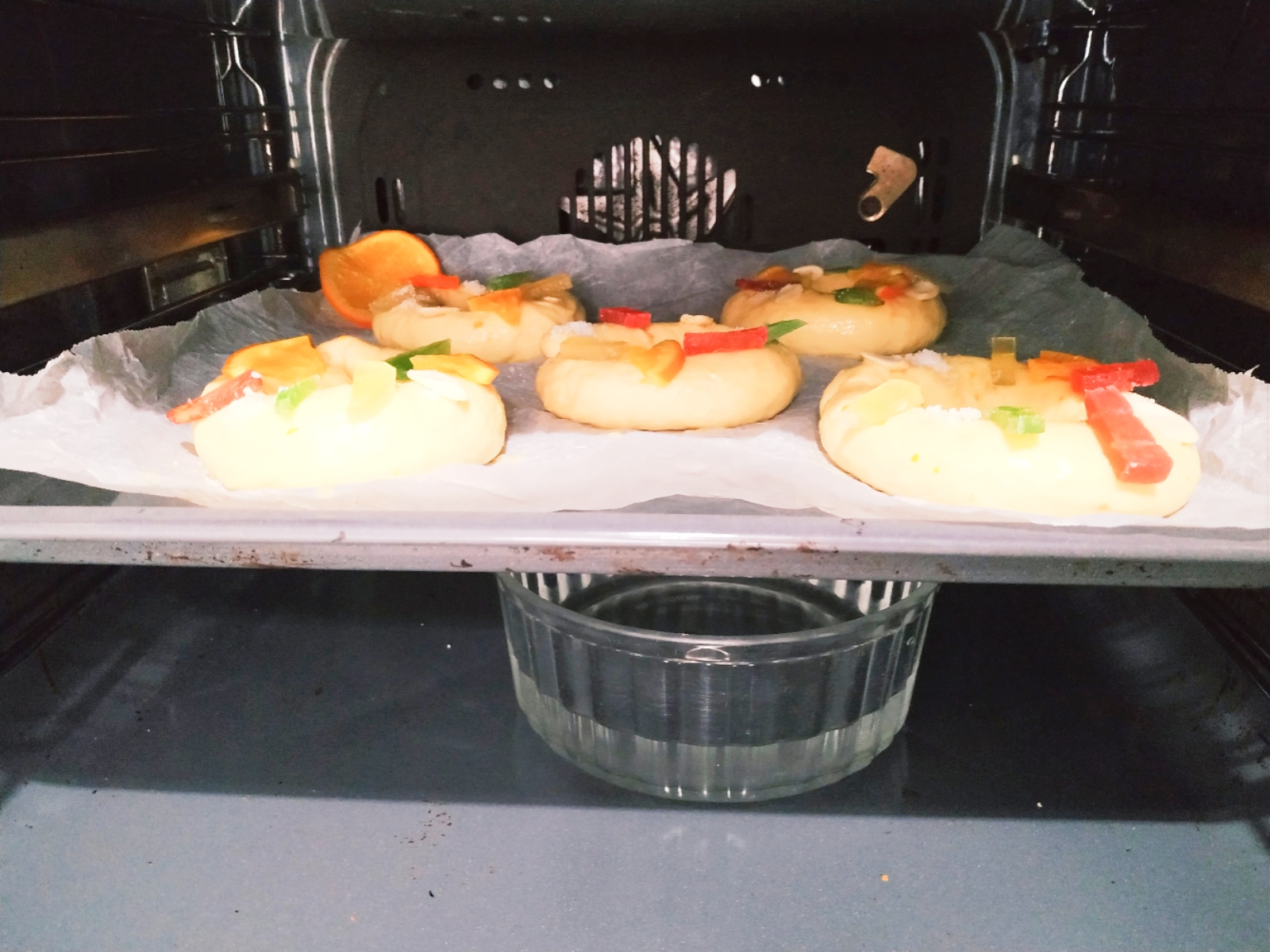Tip: Para acelerar el ultimo levado pon los roscones en el horno apagado previamente calentado a 50°C y con un cuenco con agua tibia debajo hasta que doble su tamaño ( aproximadamente 30 min) Retira las bandejas y cúbrelas con film transparente.