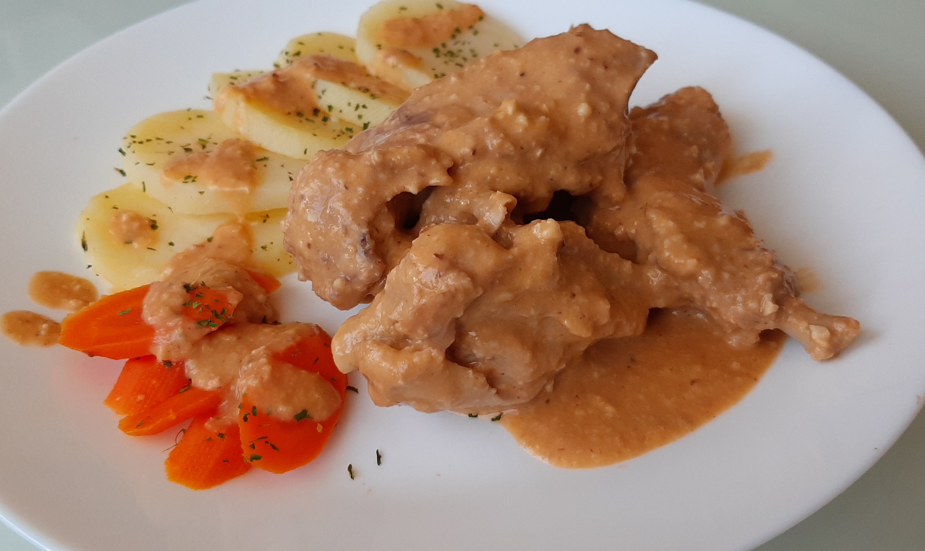 Conejo con salsa de almendras con patatas y zanahorias al vapor