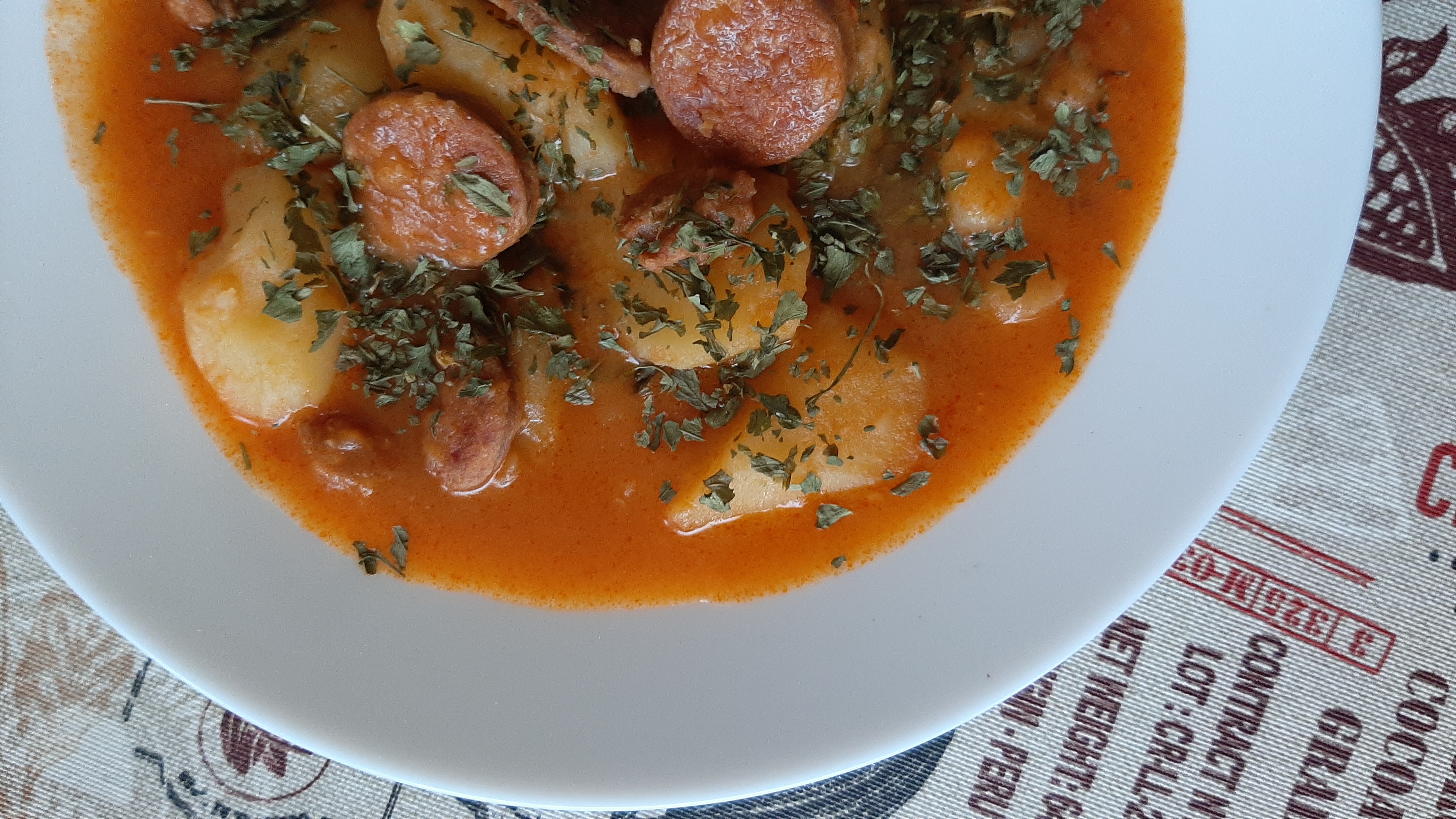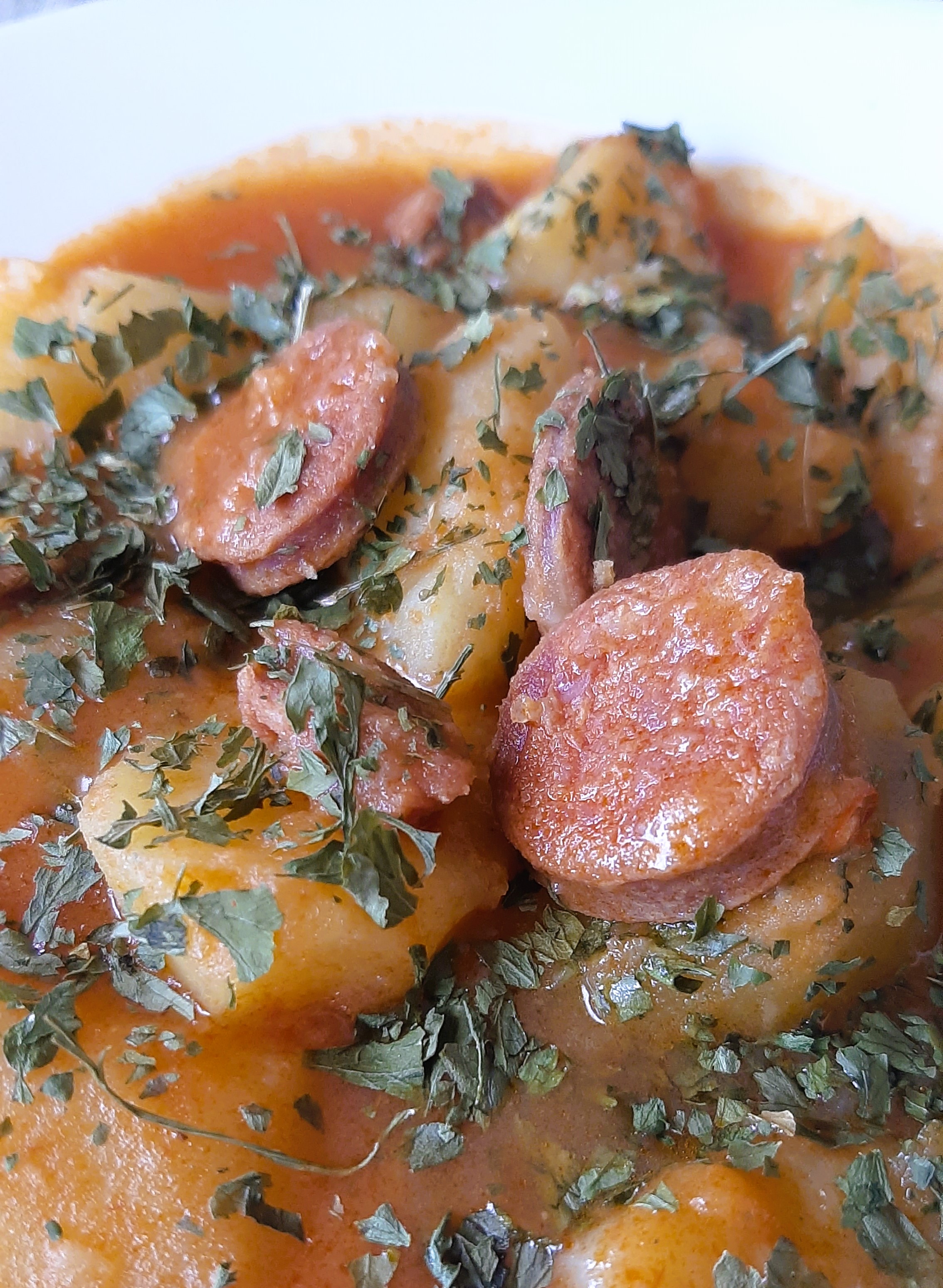 - Es un plato con tres ingredientes principales: la patata, el chorizo y el pimentón. Se sirve caliente.