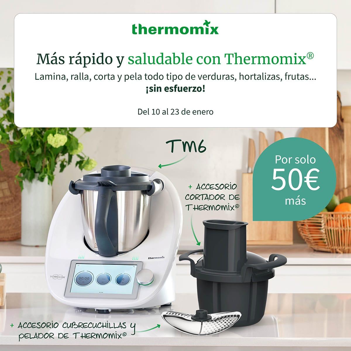 Desde el 10 de Enero hasta el 23 de Enero adquiriendo tu Tm6 y por solo 50€ mas disfrutaras del cortador-pelador + el cubrecuchillas (Valorados en 135€)