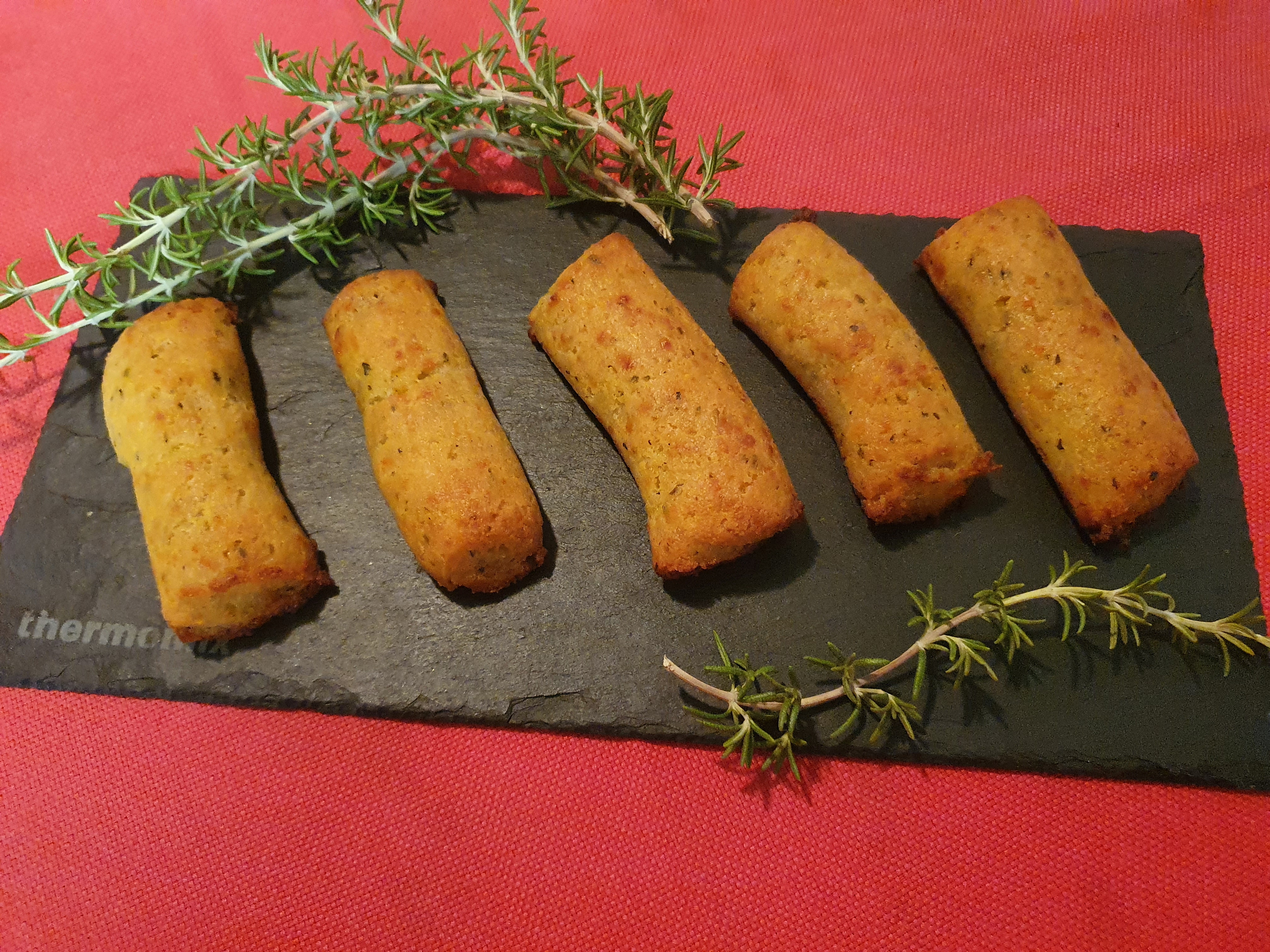 Coloque el vaso de nuevo en la máquina. Con la espátula, desprenda la masa de la base del vaso y añada los huevos y el queso rallado reservado. Amase 2 min/espiga y deje reposar en el vaso durante 20 minutos. Vierta la masa en una manga pastelera con una boquilla lisa (Ø 16 mm) forme 16 barras de masa en cada bandeja (de aprox. 12 cm de largo).