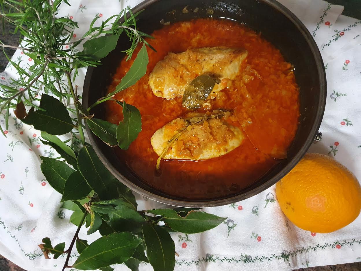 Ponga las pechugas en un recipiente con la salsa del escabeche el laurel, la piel de naranja y el romero. Deje reposar al menos 24 horas en el frigorífico antes de servir