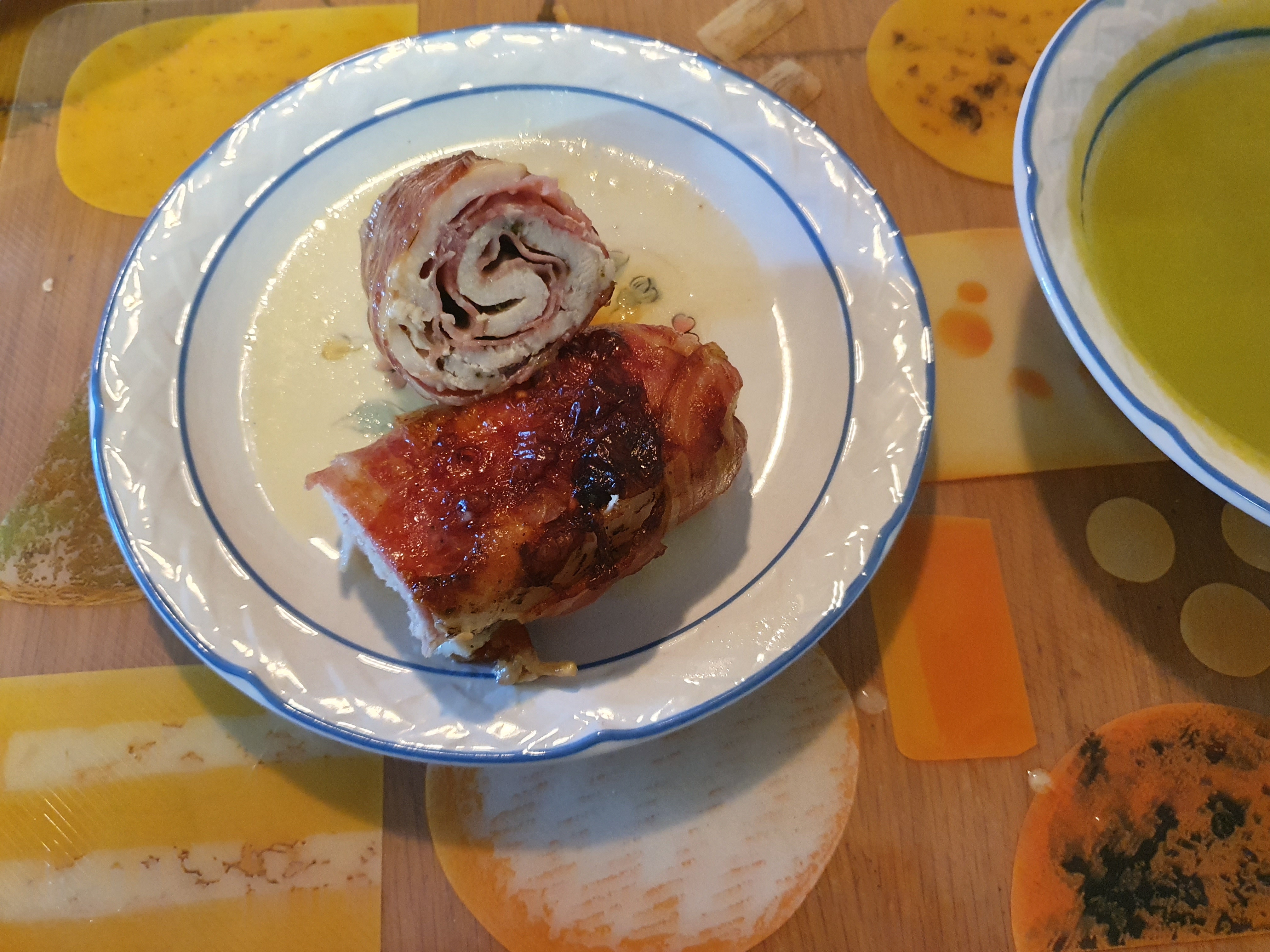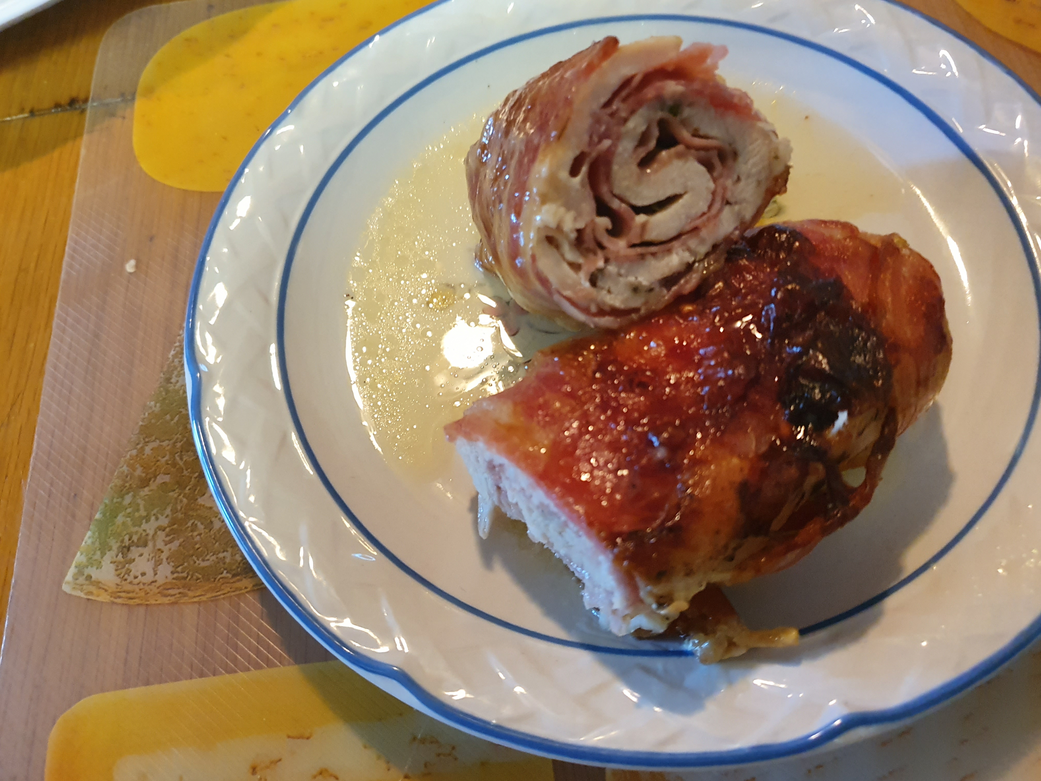 Vaso lleno de verduras variadas y agua, en Varoma, beicon pechuga de pollo york y queso, hacemos un rollito sobre papel de transparente y al Varona, al programamos manual nuestro thermomix, 25min / varona/ Vel 1 , poner los rollitos en bandeja de horno a gratinar unos min hasta que este dorados y a degustar