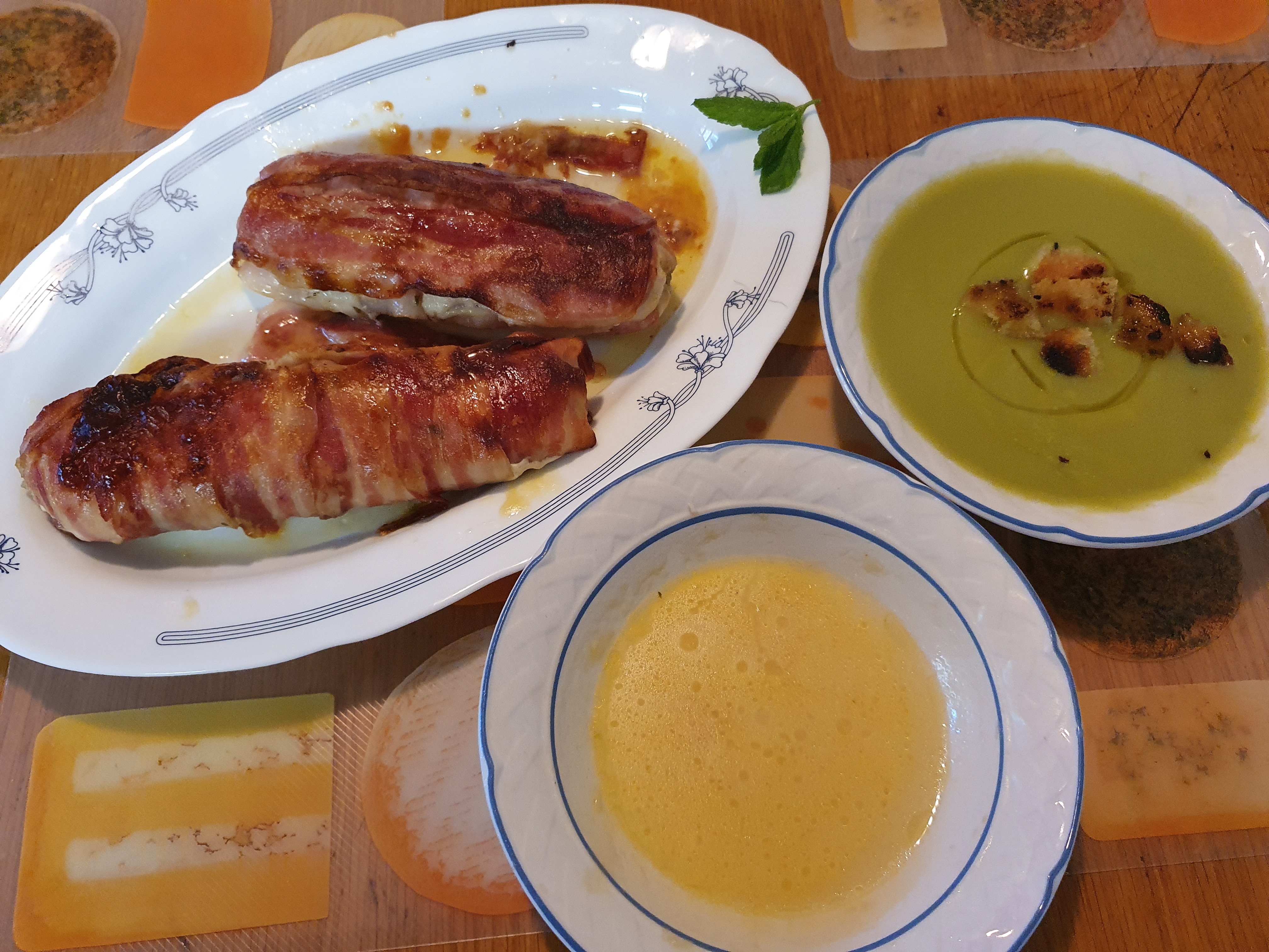 Hoy, Menú Completo de crema de verduras y pechuga de pollo rellena.