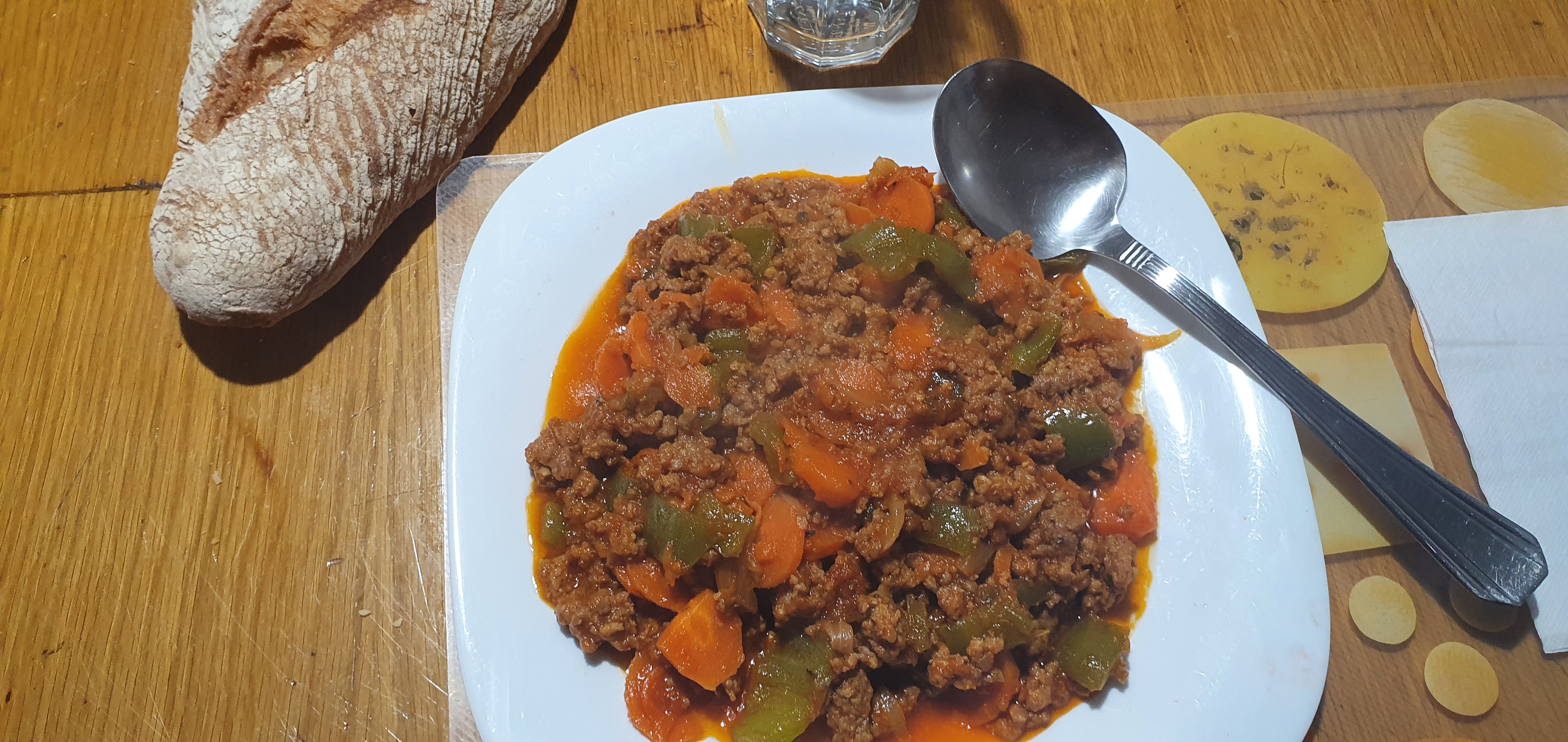 Zanahoria, pimiento, cebolla,1 ajo, 5 cucharadas de tomate en conserva, 300 g carne picada, tomillo, orégano, pimentón dulce, pimienta negra, sal , 50 g aceite oliva Virgen.
