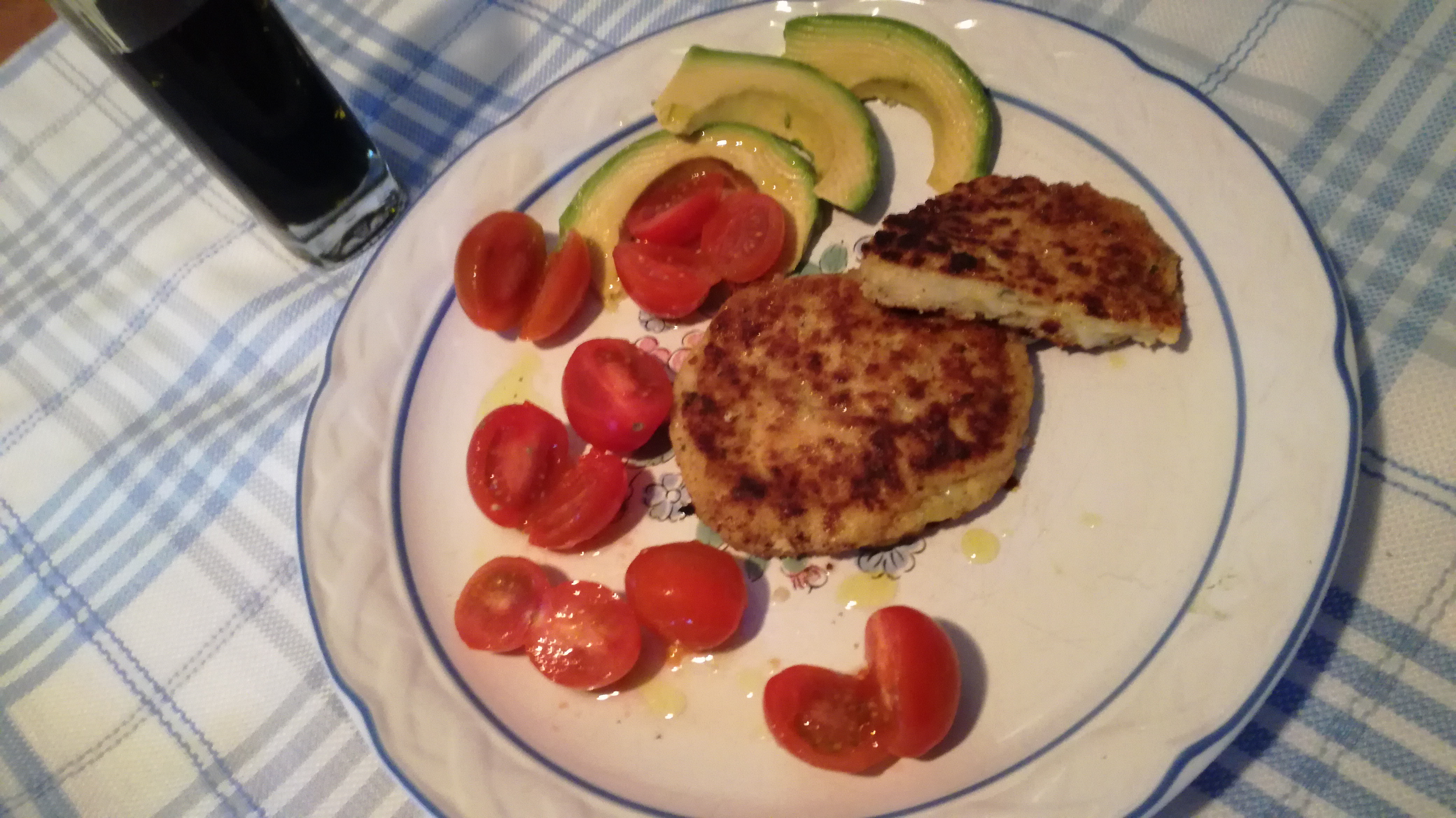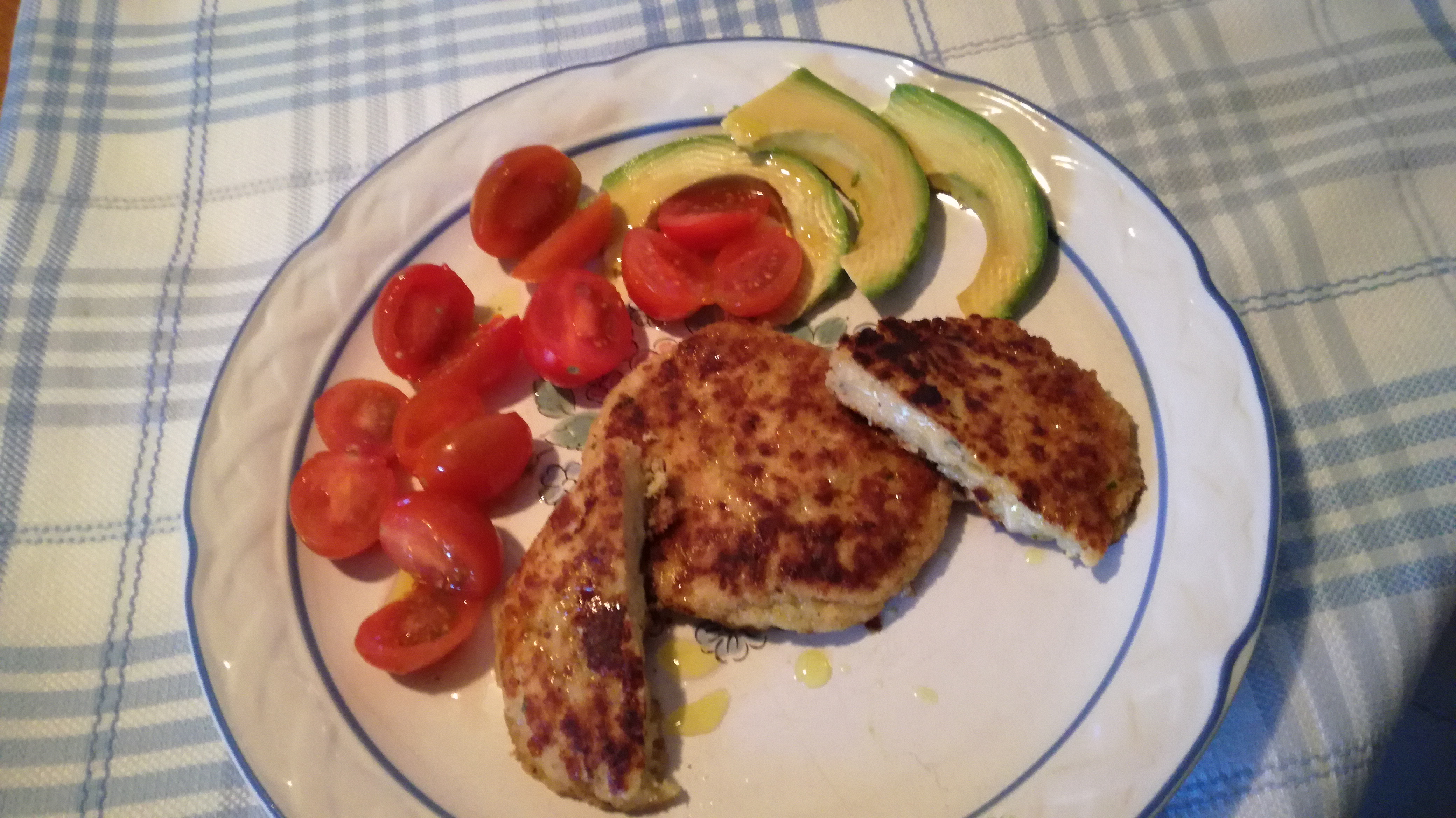 2. Ponemos en el vaso la coliflor cocida, los huevos, el tomate, la sémola, la crème fraîche o (nata o yogur), el queso, las hierbas, la sal, la pimienta y el pan rallado. Trocee 5 seg/vel 5. Divida la masa en porciones y damos forma de bola. Después, aplastamos y espolvoreando con algo más de pan rallado para formar las hamburguesas.