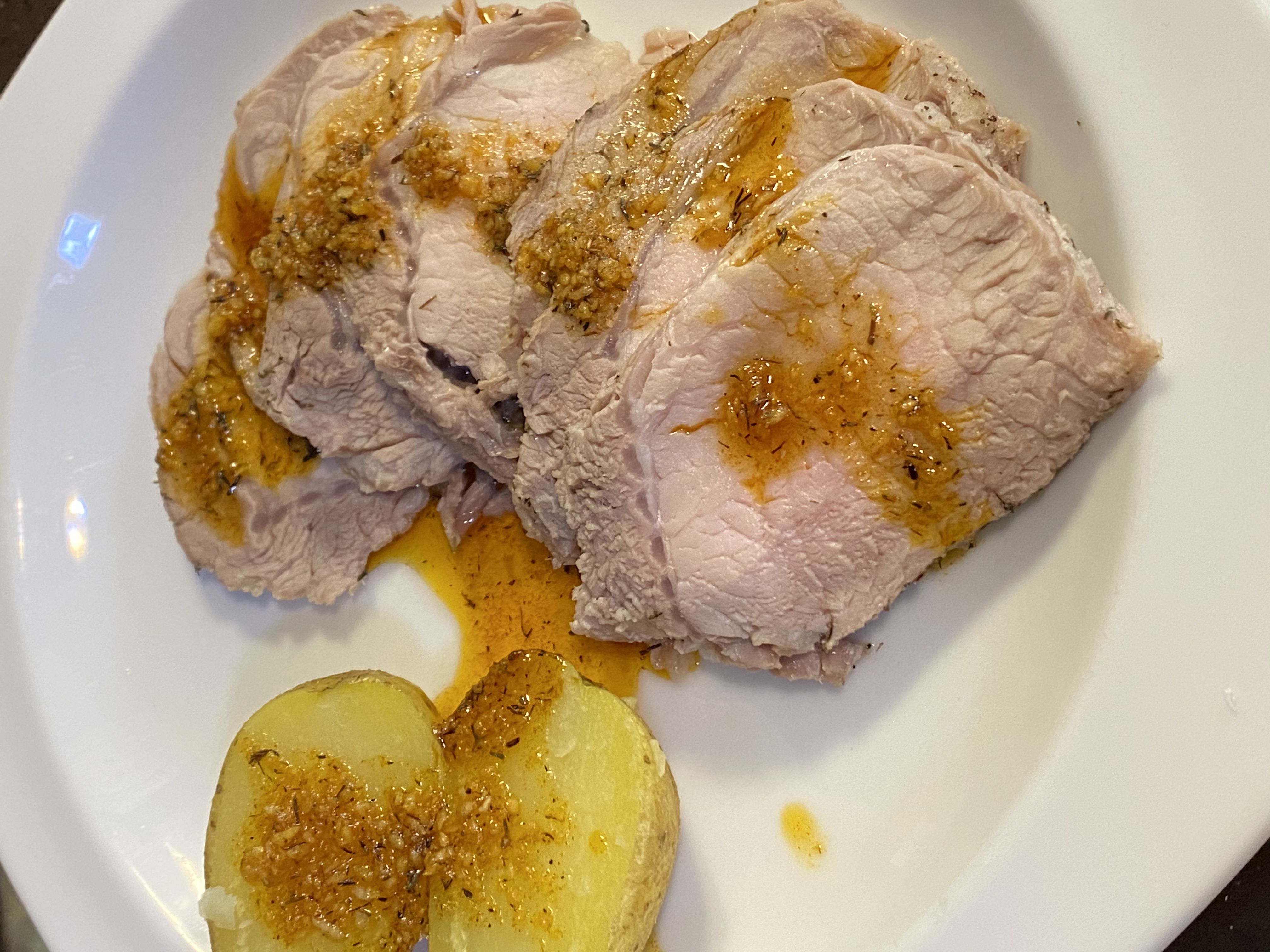 Lomo de cerdo a la sal con salsa de tomillo al pimentón
