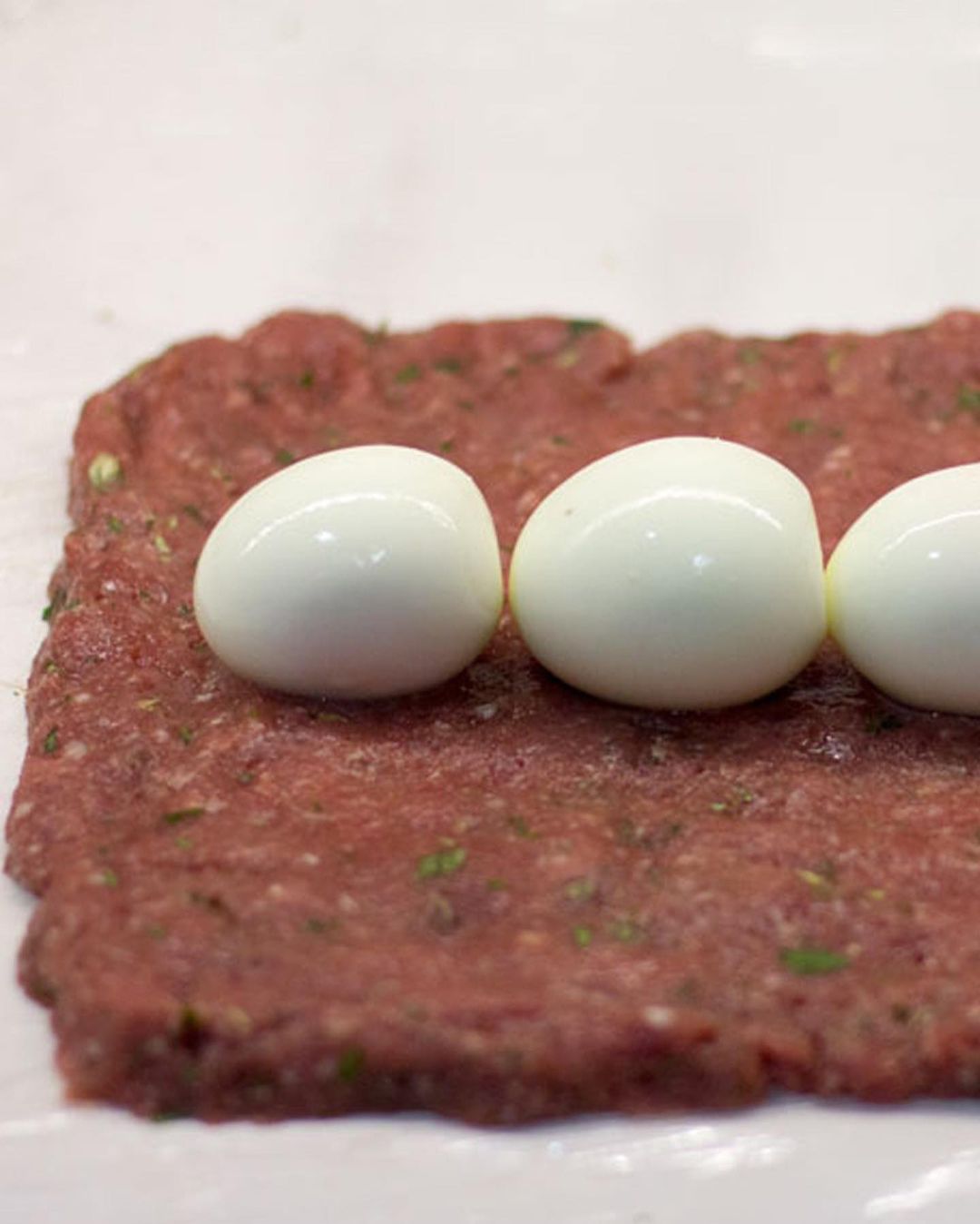 ➡️ Extiende sobre la superficie de trabajo un papel film transparente y pon sobre éste la carne picada aderezada reservada. Extiende formando un rectángulo y coloca los huevos cocidos pelados encima.