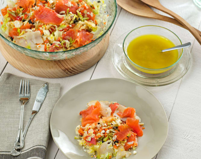 Ensalada de ahumados no vinagreta de alcaparras, mostaza y miel. https://cookidoo.es/recipes/recipe/es/r67766 Cara al tiempo que vamos nos apetece cada vez más recetas frescas, y veraniegas. Verduras variadas, huevos duros y ahumados, con lo que también es muy completa y tiene 438 kcal por ración.