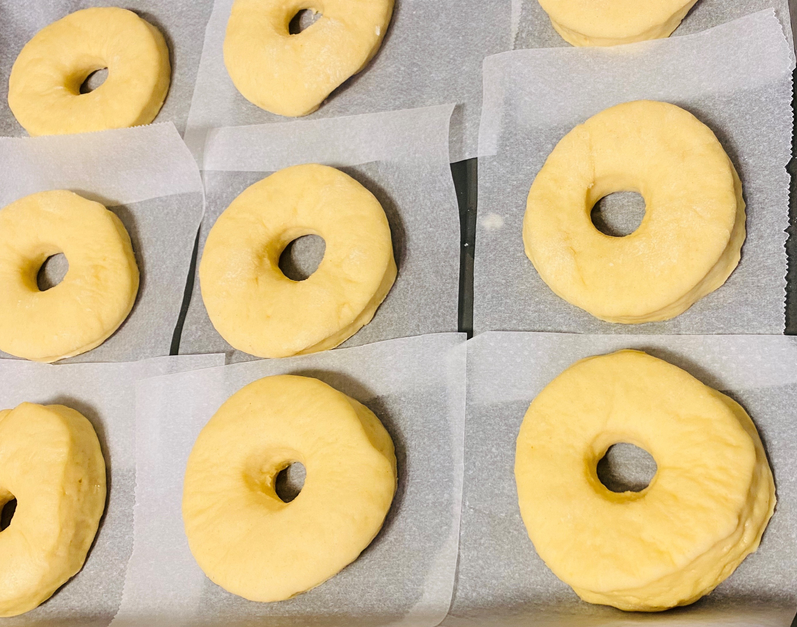 Amásela ligeramente para sacarle el aire y forme un cilindro. Divida la masa en 24 porciones iguales (de aprox. 55 g). Haga una bola con cada porción y, con los dedos, abra un agujero de Ø 4 cm en el centro. Coloque los aros de masa sobre una superficie espolvoreada con harina, cúbralos con un paño y déjelos reposar hasta que doblen su volumen (aprox. 30 minutos).