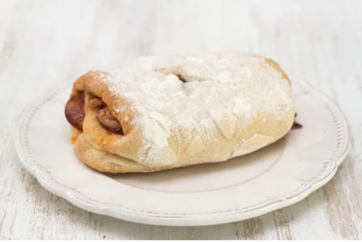 - ➡️Divida la masa en 18 porciones de aprox. 50 g cada una. Aplaste con la mano cada porción de masa (o utilice un rodillo) hasta obtener un círculo de Ø 10-12 cm. Coloque en el centro 1 trozo de longaniza abierta por la mitad y ciérrelos formando pliegues.